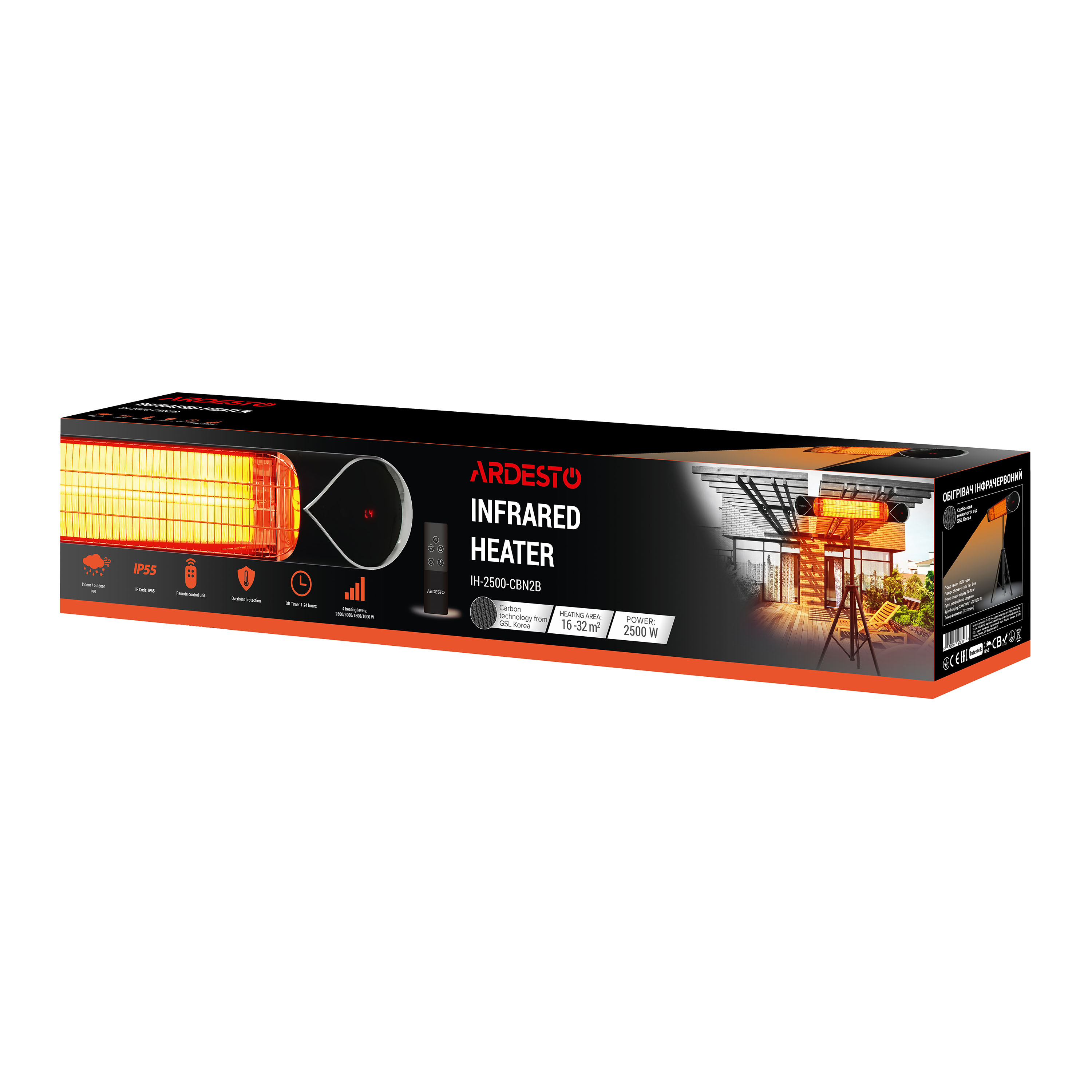 Обігрівач отримав захист від струменів води та пилу за стандартом IP55. Це дозволяє використовувати пристрій як у приміщені, так і на вулиці. Дюралюмінієвий корпус покрито термостійкою порошковою фарбою, а лицьова панель з нагрівальним елементом захищена хромованою решіткою. Ardesto IH-2500-CBN2B продається без стенду. Телескопічний стенд IH-TS-01 дозволяє регулювати висоту від 1,1 до 1,8 м. Конструкція обігрівача також підтримує настінний та стельовий монтаж. Для дистанційного керування є пульт.