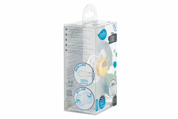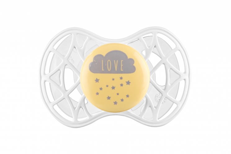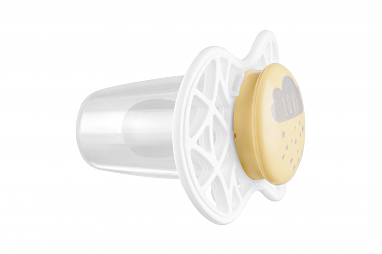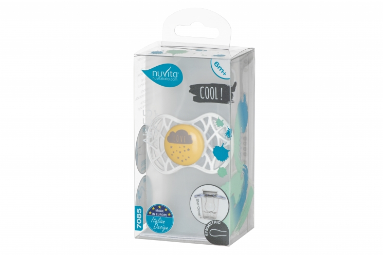Пустушка симетрична Nuvita NV7085 Air55 Cool 6m + "LOVE" жовто-сіра. Пластина соски на 55% складається з повітря забезпечуючи майже повну аерацію області навколо рота, уникаючи скупчення слини, яка може подразнювати шкіру. Захисний ковпачок для соски для підтримки чистоти соски і стерилізації в мікрохвильовій печі простим додаванням води.