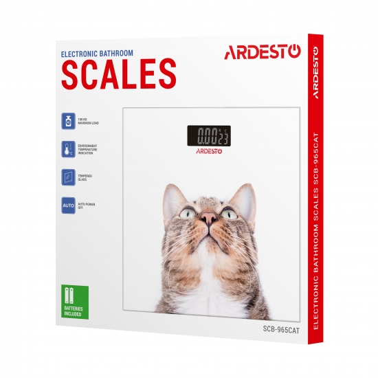 Підлогові ваги з дизайнерським малюнком. Призначені для вимірювання маси тіла та оснащені вбудованим термометром і функцією порівняння попередньої ваги. Модель SCB-965CAT виконана в ексклюзивному дизайні. Малюнок з котом надає вагам властивості модного аксесуара для прикраси будь-якого приміщення.