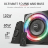 Приголомшлива потужність низьких частот, висока якість звуку та вражаючий ігровий дизайн — все в одному: комплект динаміків GXT 629 Tytan 2.1 з підсвічуванням RGB змінить ваше уявлення про звук. Граючи в найновіші ігри, слухаючи музику або переглядаючи фільми, все це ви робитимете з найкращим звучанням. Ці динаміки не тільки підсилюють потужний звук, вони вибухають кольором! Різнокольорове світлодіодне підсвічування RGB на сабвуфері в поєднанні з матово-чорними сателітними динаміками підійдуть до будь-якої конфігурації ігрової станції. Ви можете обрати один із 7 однотонних кольорів, синхронізованих з басами (червоний, зелений, синій, жовтий, фіолетовий, блакитний та білий). Або ж оберіть циклічне чергування всіх кольорів, пульсуюче підсвічування з чергуванням кольорів чи підсвічування RGB, синхронізоване з басами: у вас є всі можливості!