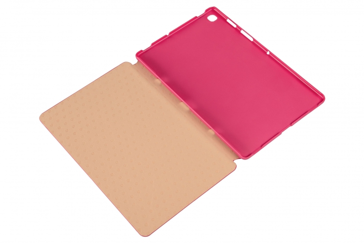 Зовнішня частина обкладинки виконана з екошкіри, внутрішня – з мікрофібри, а фіксатор з полікарборнату. Завдяки спеціальним рельєфним насічках на внутрішній пластикової частині, стенд може бути встановлений в будь-яке зручне положення. Обкладинка фіксується за допомогою магніту.