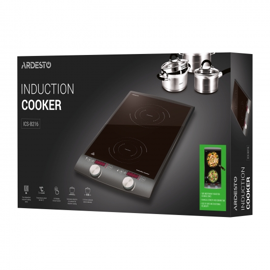 Корпус пристрою зроблено з міцного пластику, а поверхня закрита загартованим склом. Дві конфорки працюють з різною потужністю – 1300 та 1600 Вт. Передбачено десять налаштувань потужності, регулювання температури відбувається у межах від 60°С до 240°С, а таймер приготування розраховано до 180 хвилин. Також передбачено надійний захист від перегріву поверхні та перепадів напруги у електромережі.