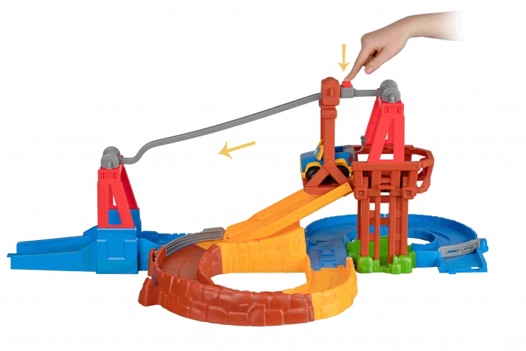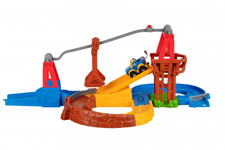 Стартовий трек серії іграшок Рев і Рамбл. Величезний трек з формою, що нагадує цифру 8, з ліфтом для машинки та канатною дорогою. Ліфт і канатна дорога рухаються та можуть бути використані для гри. Трек підходить для будь-яких машинок серії Power Up, в комплект також входить іграшка Power UP Рамбл (аналогічна арт. EU881210), для роботи якої буде потрібно 2 ААА батарейки. Батарейки до комплекту не входять. Для роботи самого треку батарейки не потрібні. У набір входить 21 елемент + машинки.
