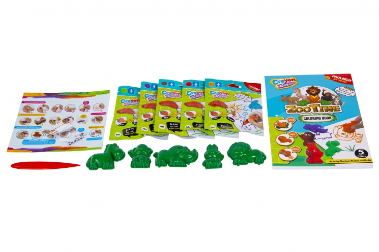 У комплекті: маса для ліплення (5 кольорів × 30 г), 5 пластикових формочок (носоріг, лев, мавпа, заєць, лоша), інструмент для ліплення, пластикові очі × 10, книжка-розмальовка, інструкція.
