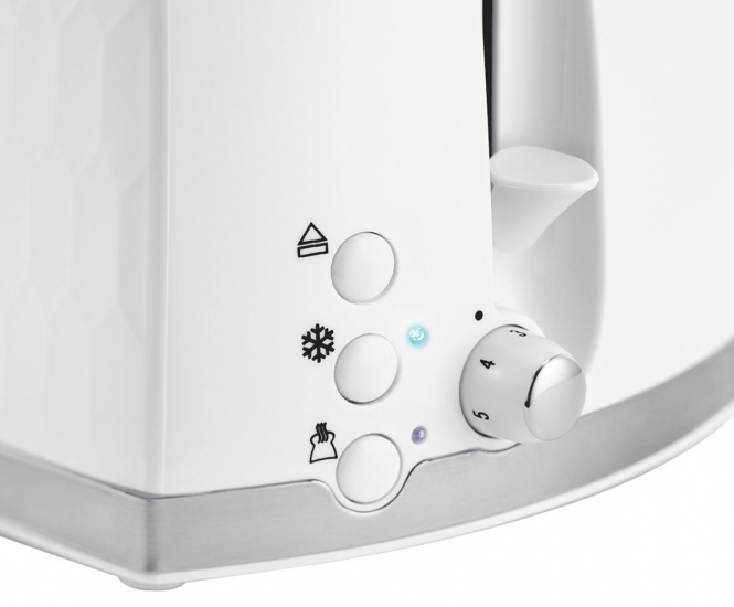 Тостер Honeycomb - це особлива комбінація стильного зовнішнього вигляду і функціональності. Корпус тостера виконаний з преміального білого пластику в формі бджолиних сот з акцентами з нержавіючої сталі. Тостер має регулювання ступеня підсмажування для створення ідеальних тостів за смаком кожного. А екстраширокі слоти дозволять вам приготувати шматочки хліба навіть товщі стандартних і рівномірно їх прожарити.