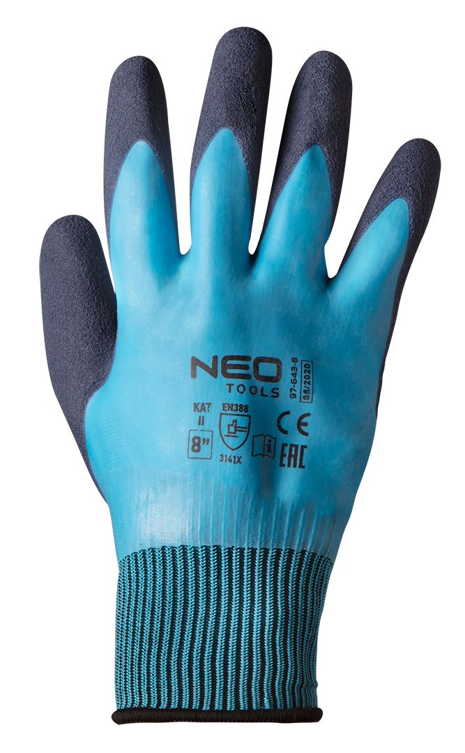 Рукавички робочі NEO, латексне покриття у 2 шари, поліестер, р.8, блакитний