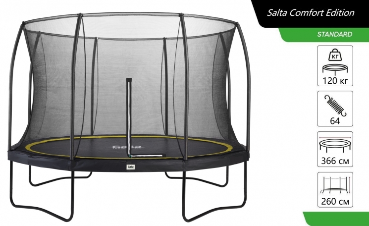 Сталевий каркас міцного батута Salta Comfort Edition виконаний з оцинкованої сталі з чорним глянцевим покриттям. Конструкція сталевого верхнього кільця утримує захисну сітку в натягнутому положенні, що дозволяє м'якій сітці з дрібними осередками надійно захищати дітей і дорослих від падіння. Крім того, батут оснащений спеціальним захисним поролоновим матом товщиною 20 мм і шириною 29 см, що покриває оцинковані конічні пружини системи батута і захищає від попадання між ними ніг і рук під час стрибків. Двостороння блискавка забезпечує легкий доступ всередину батута і дозволяє легко закривати Salta Comfort Edition з внутрішньої сторони.