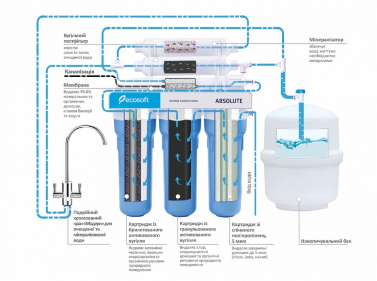 Головна - Побутова техніка, інструменти та товари для дому - Сантехніка - Системи очищення води - Ecosoft - Фільтр зворотнього осмосу Standard 5-50P (1 вугілл. картридж, простий кран, 50 галл)