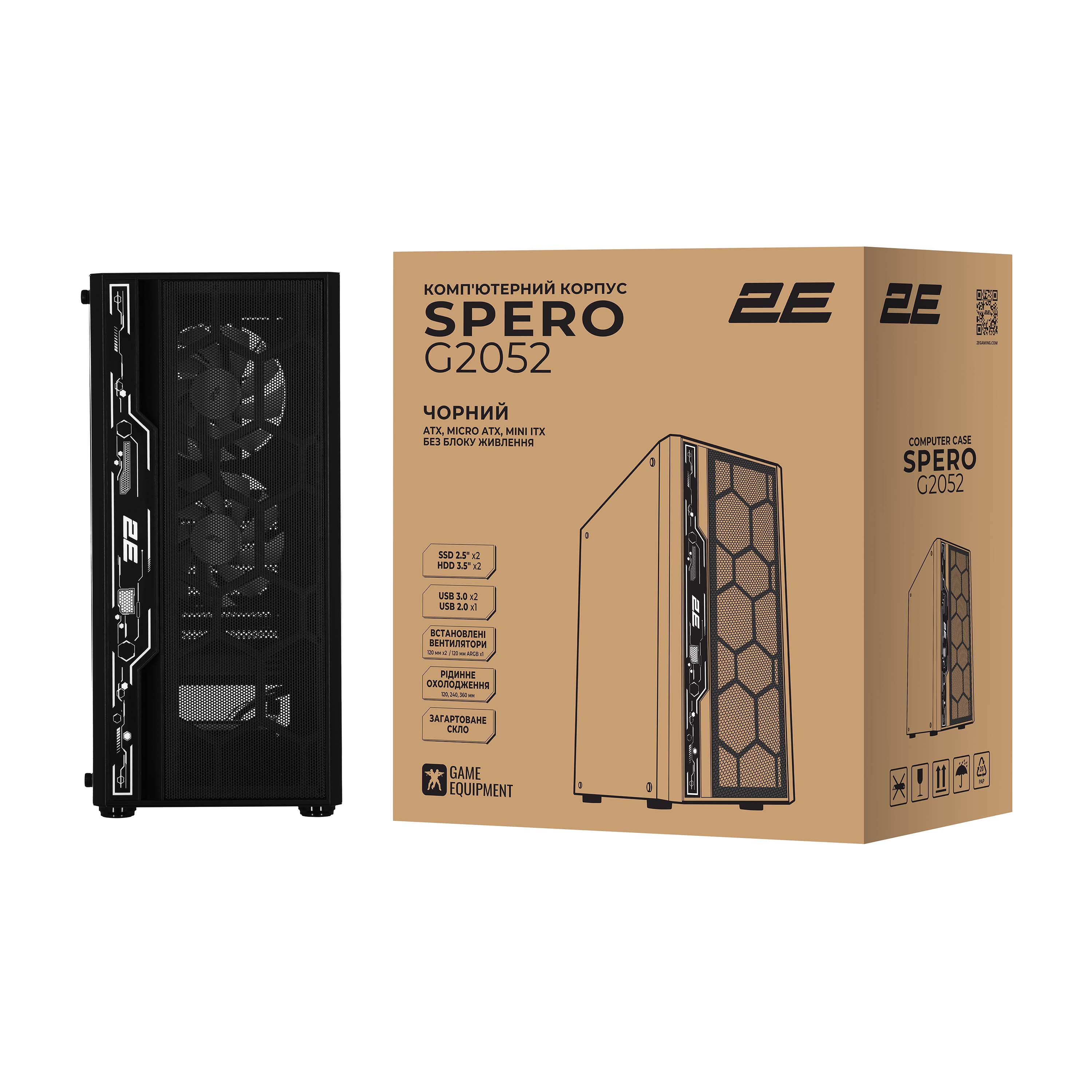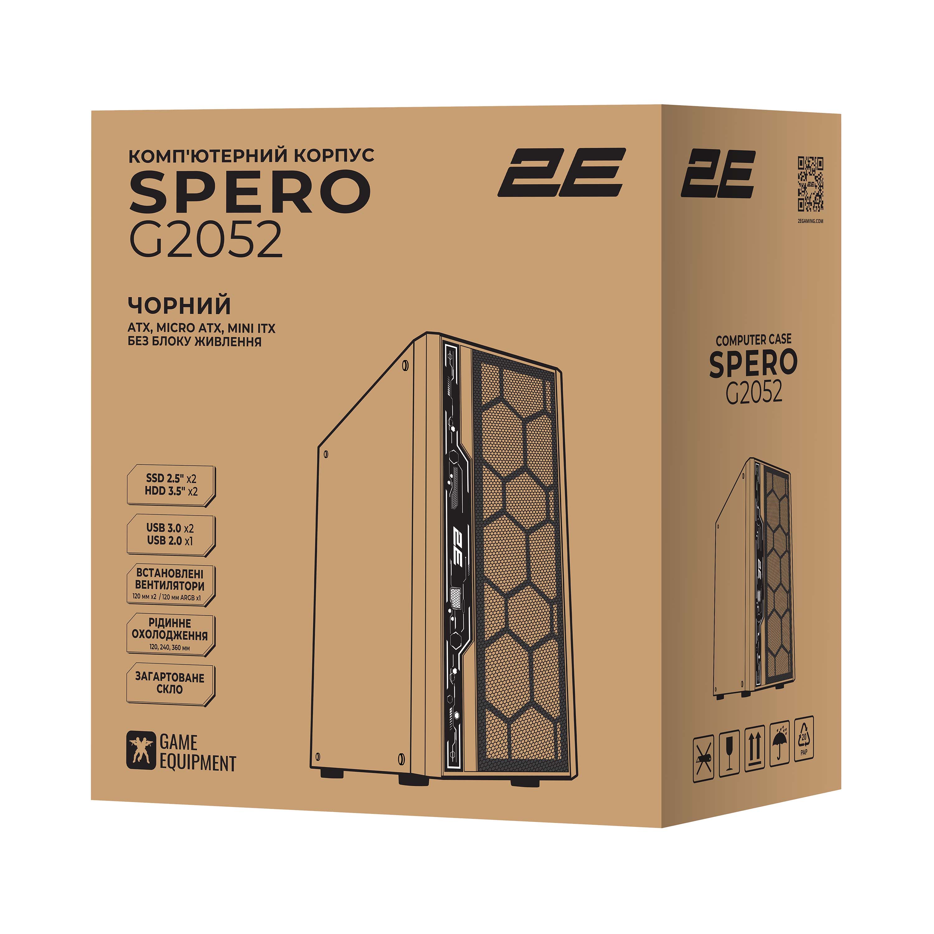 Опис Корпус 2E GAMING Spero G2052 без БЖ 2xUSB3.0, 1xUSB2.0, 1x120мм ARGB, 2x120мм, VGA 345мм, LCS ready, TG Side Panel, ATX, чорний