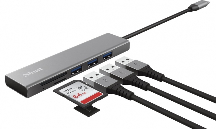 Комбінований комплект Trust Halyx USB і кард-рідер приходить на допомогу всім, кому потрібно швидко передавати дані, підключаючи при цьому свої найважливіші периферійні пристрої до ноутбука. Цей невеликий концентратор дозволяє підключати до комп'ютера до трьох USB-пристроїв, використовуючи тільки один порт USB-C. І він поставляється з швидким (мікро) пристроєм читання карт SD для завантаження.