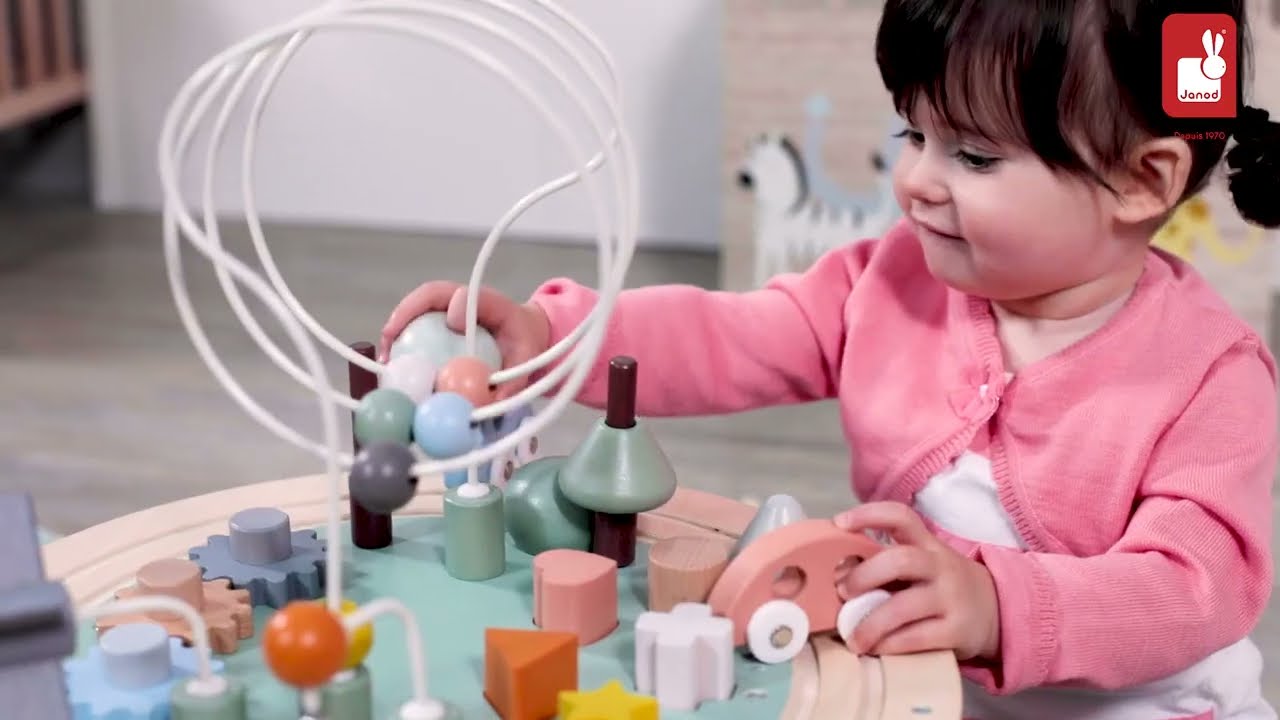 Цей стіл із кількома видами діяльності-це концентрація їх улюблених занять: кругова залізнична колія із 2 транспортними засобами, що дзвонять у дзвінок, невеликий млин, 2 дерева для складання, 3 петлі з намистинами, 3 зубчасті передачі для обертання та 5 фігур, які підходять до них. Ніжки столу роблять його практичним. Дійсно, їх можна зібрати в 2 різних положеннях, щоб адаптувати висоту столу до зросту дітей. У нижньому положенні стільниця має висоту 14 см, проти 22,5 см у високому. Цей стіл для занять покритий фарбою на водній основі.