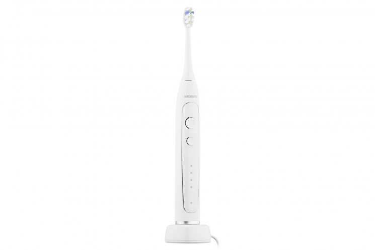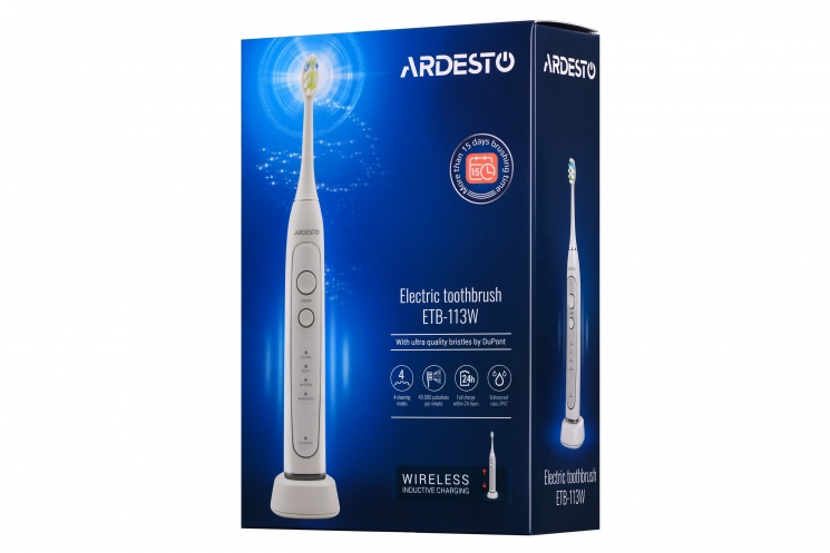 Електрична зубна щітка ARDESTO ETB-113W зі звуковою технологією чищення та середньою жорсткістю щетини DuPont. Набагато краще видаляє, ніж звичайні щітки, зубний наліт і камінь. Має чотири режими роботи: стандартне чищення, для чутливих зубів, відбілювання та масаж ясен.