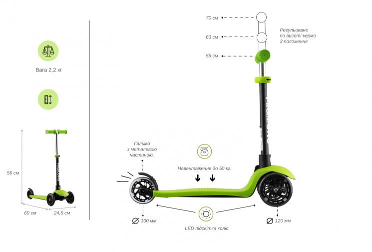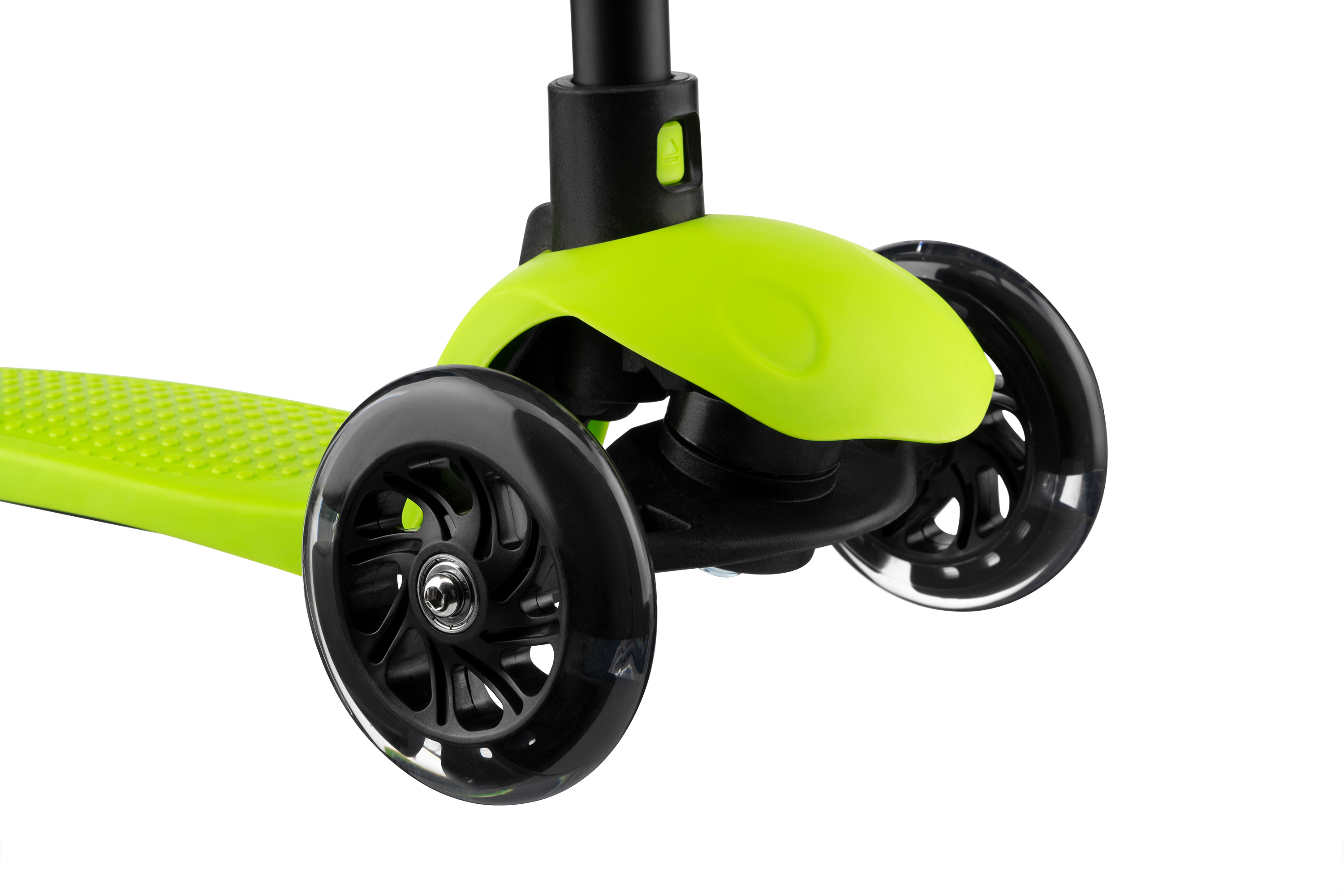 Заднє колесо має надійне ножне гальмо з металевою вставкою. Поліуретанові колеса мають LED-підсвічування.