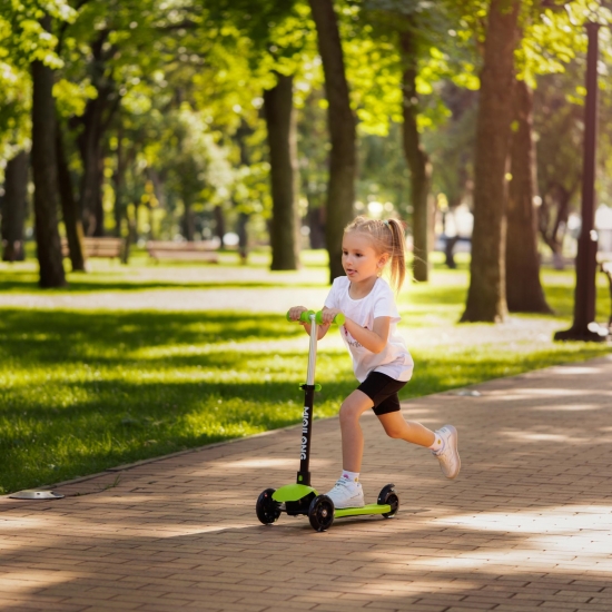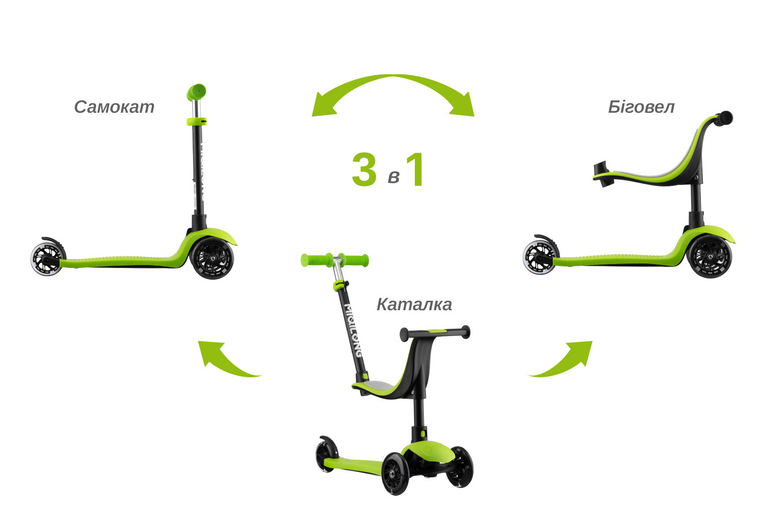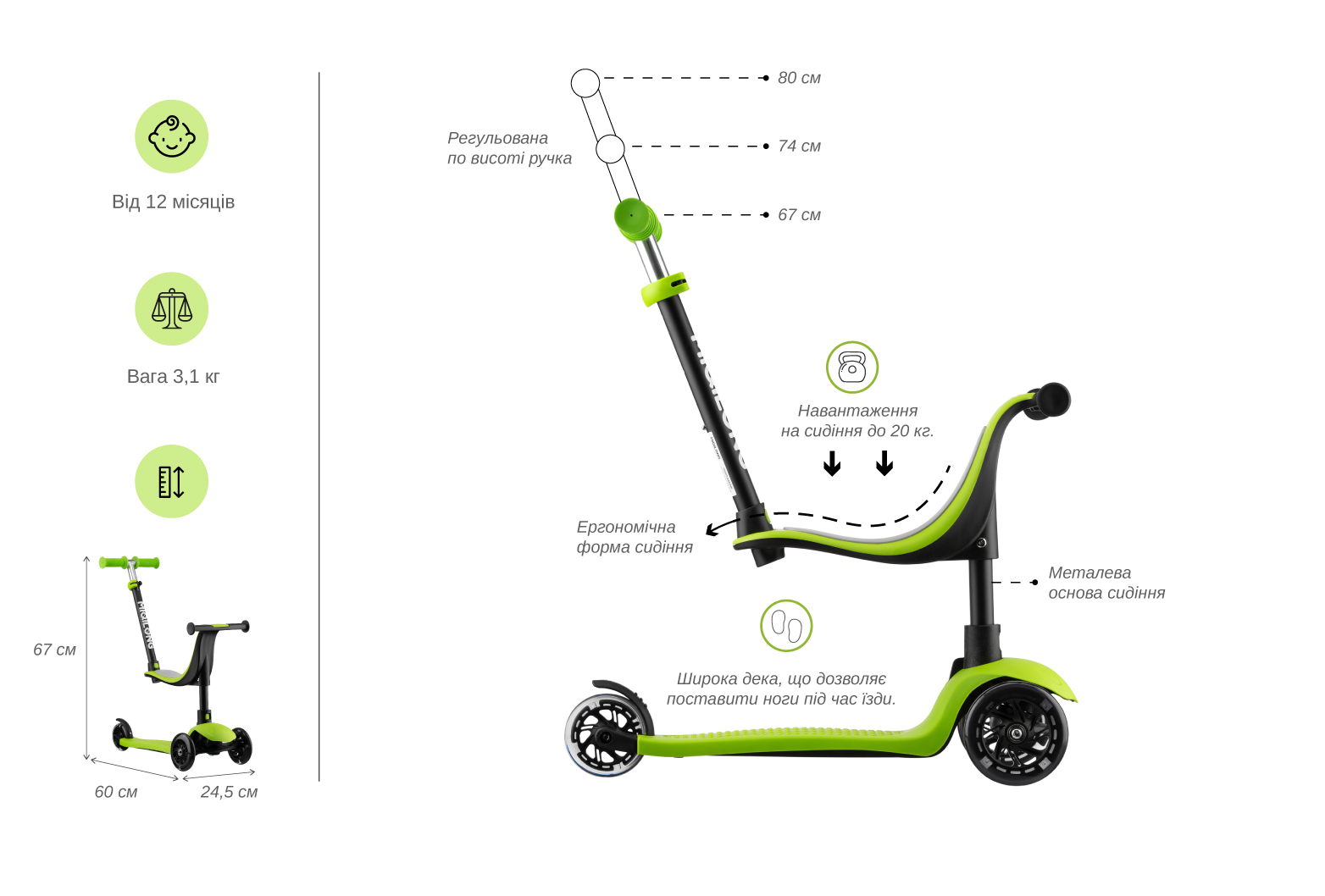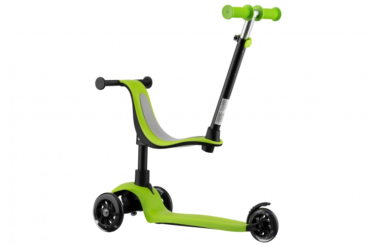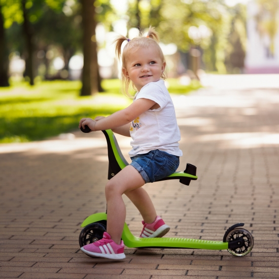 У варіанті 3-колісного самокату дитина розміщується стоячи на деці і керує самокатом самостійно.