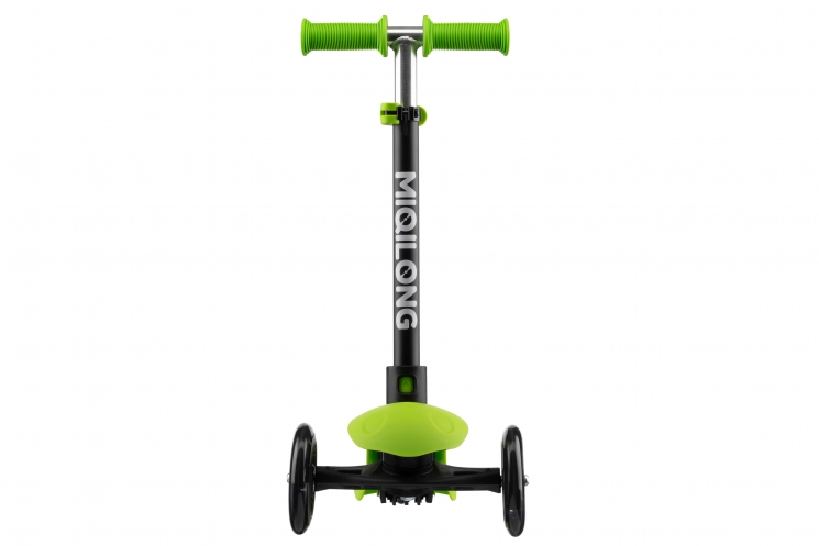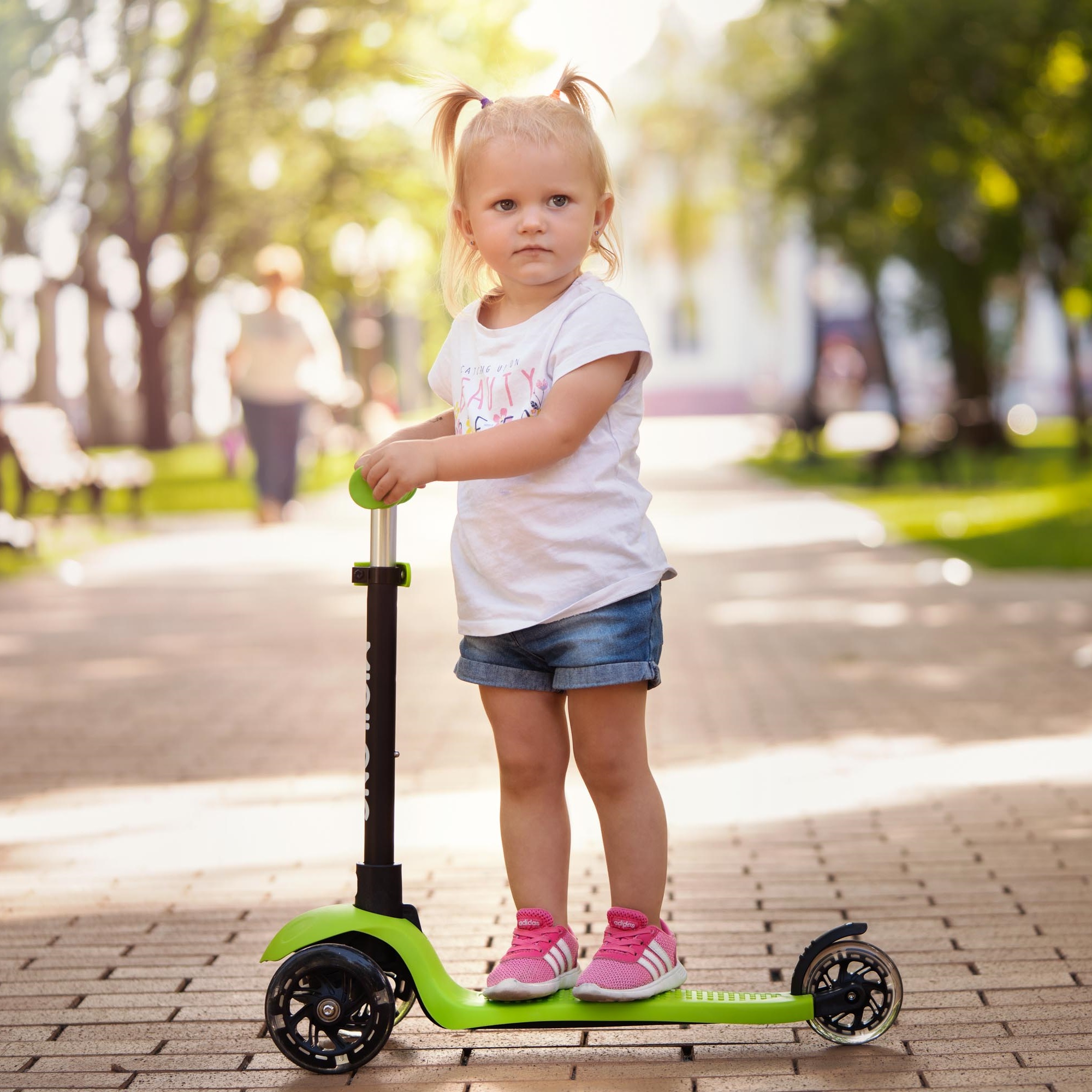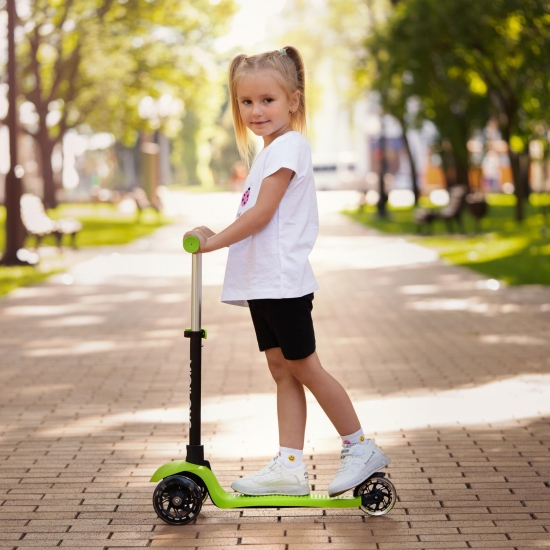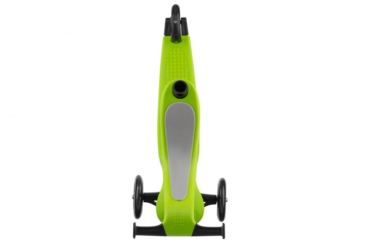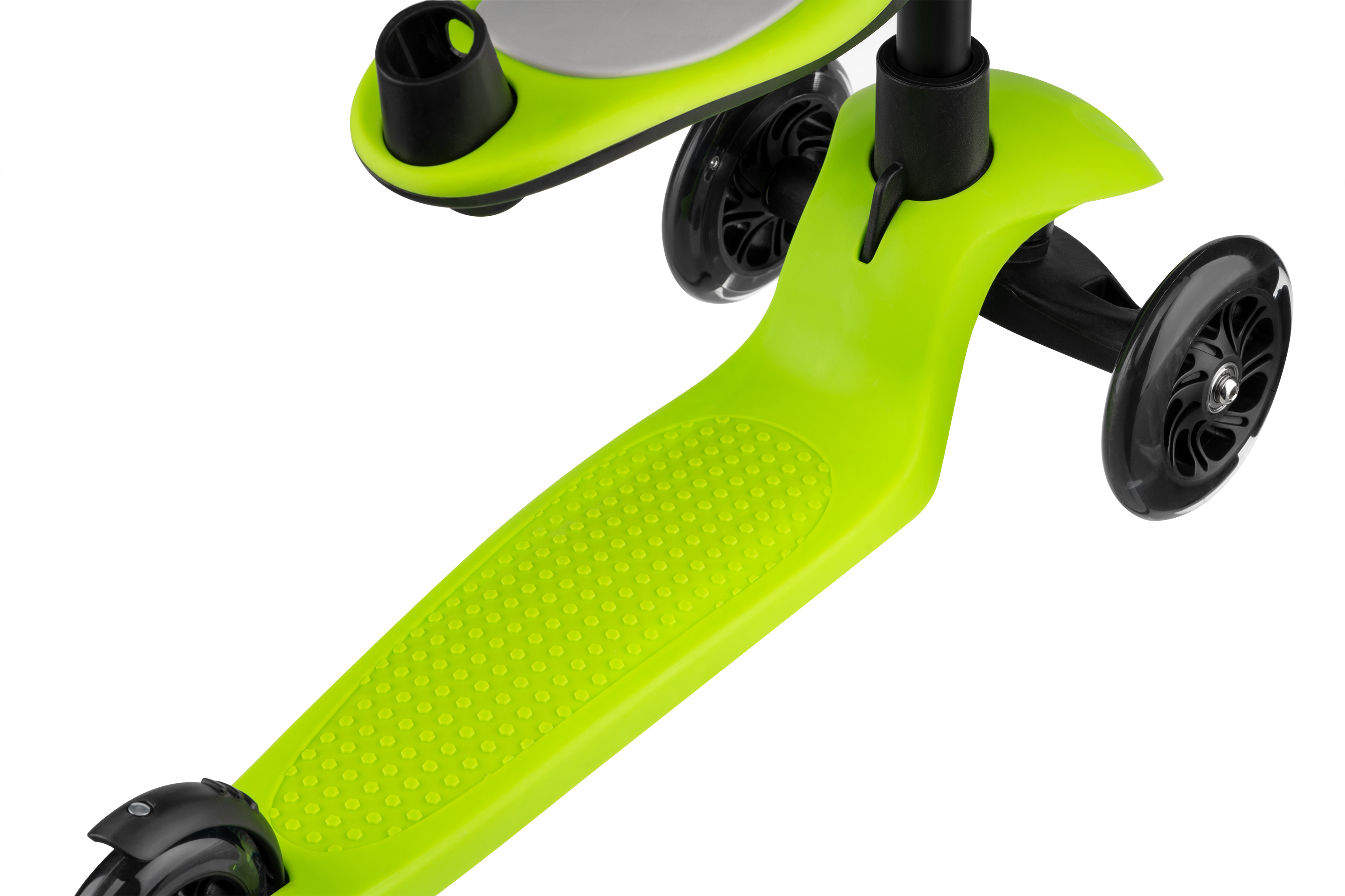 У варіанті 3-колісного самокату дитина розміщується стоячи на деці і керує самокатом самостійно.