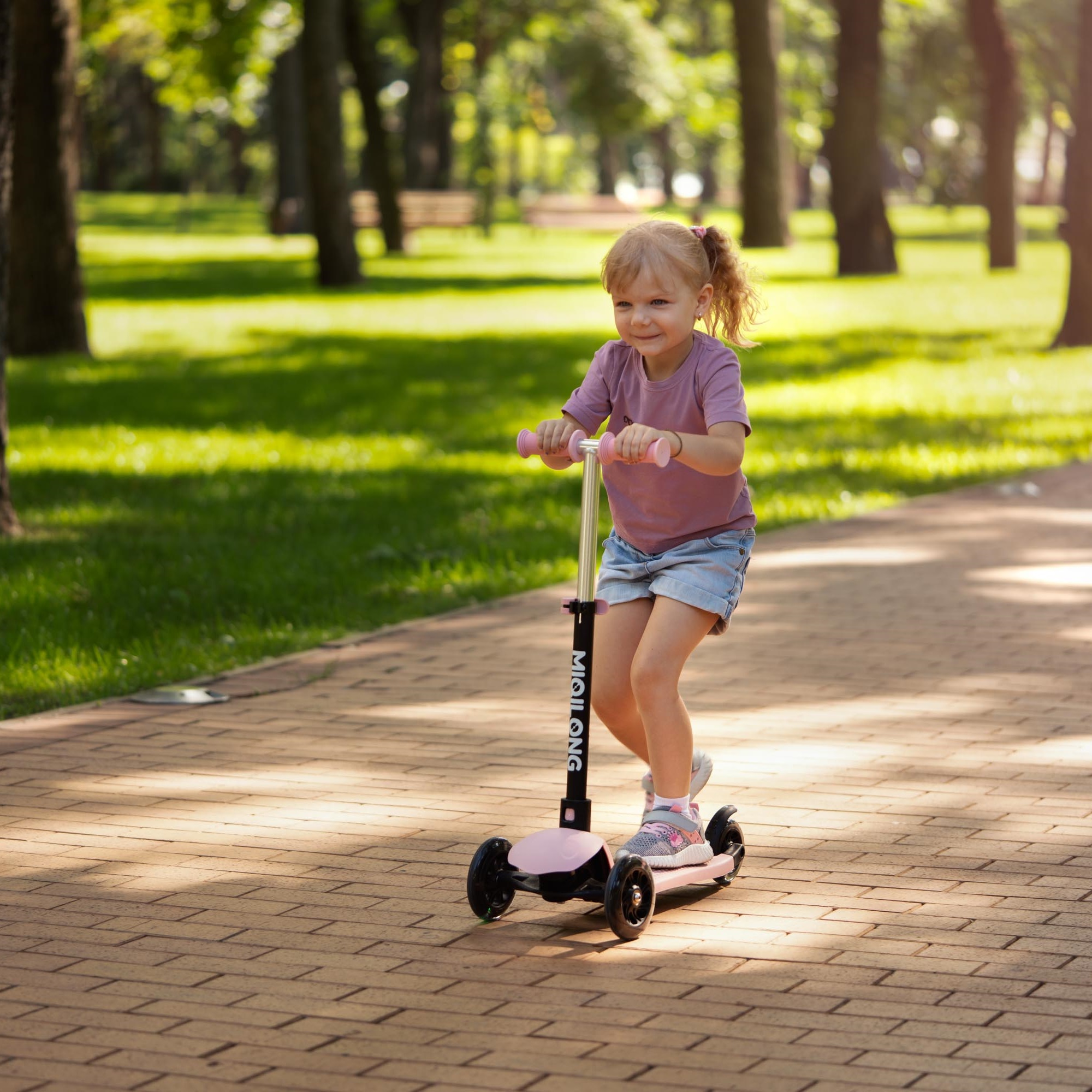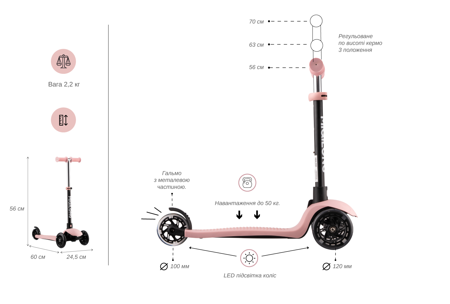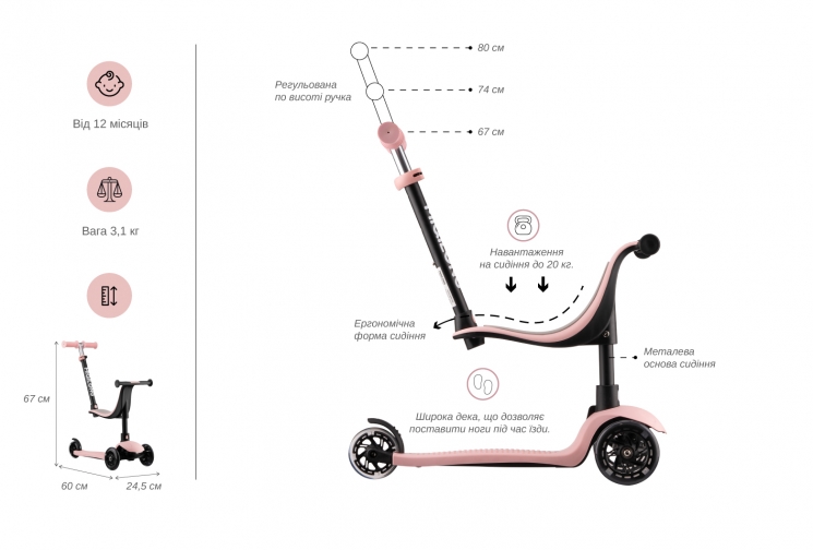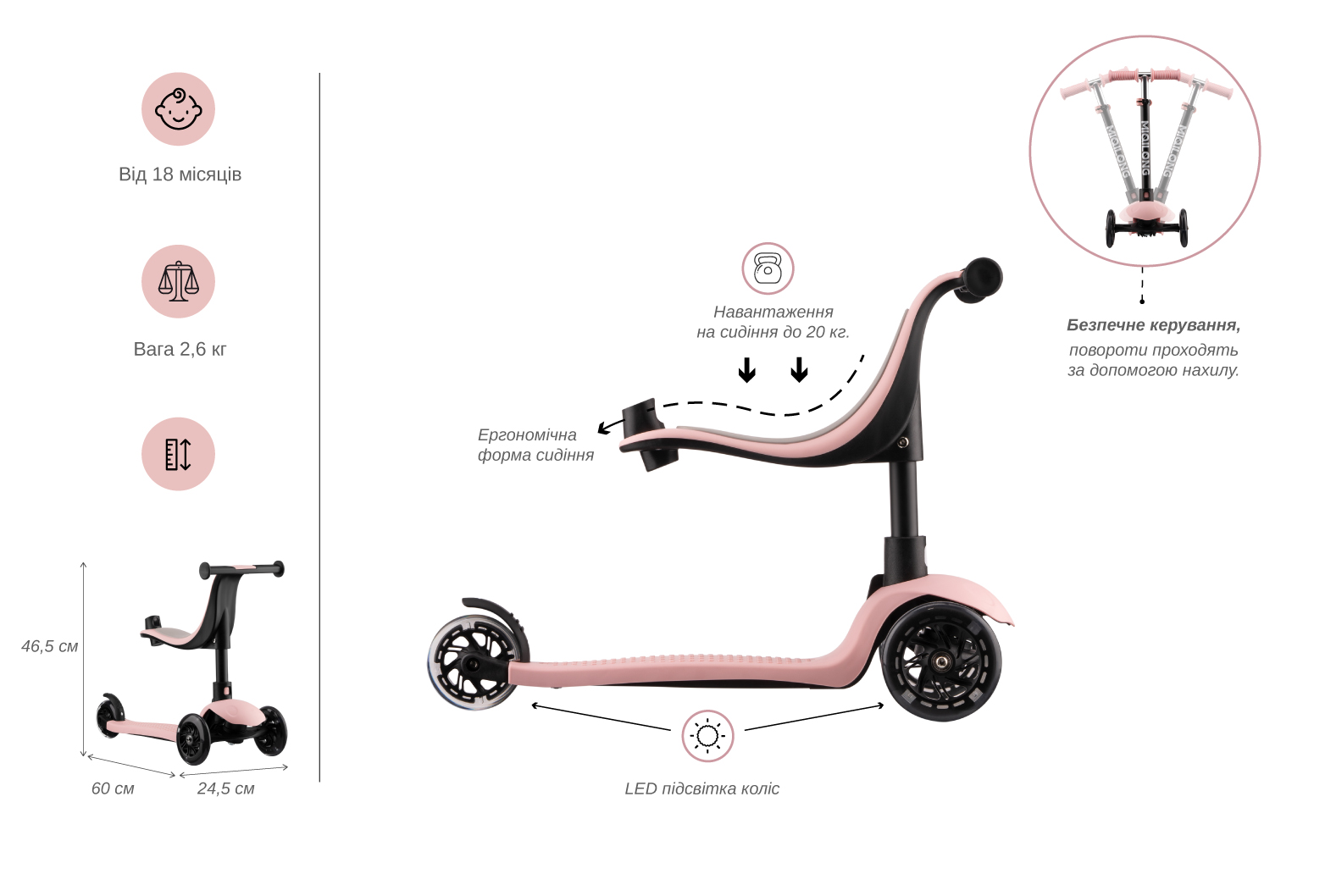 3-х колісна компоновка забезпечує стійкість і простоту катання навіть для найменших дітей.