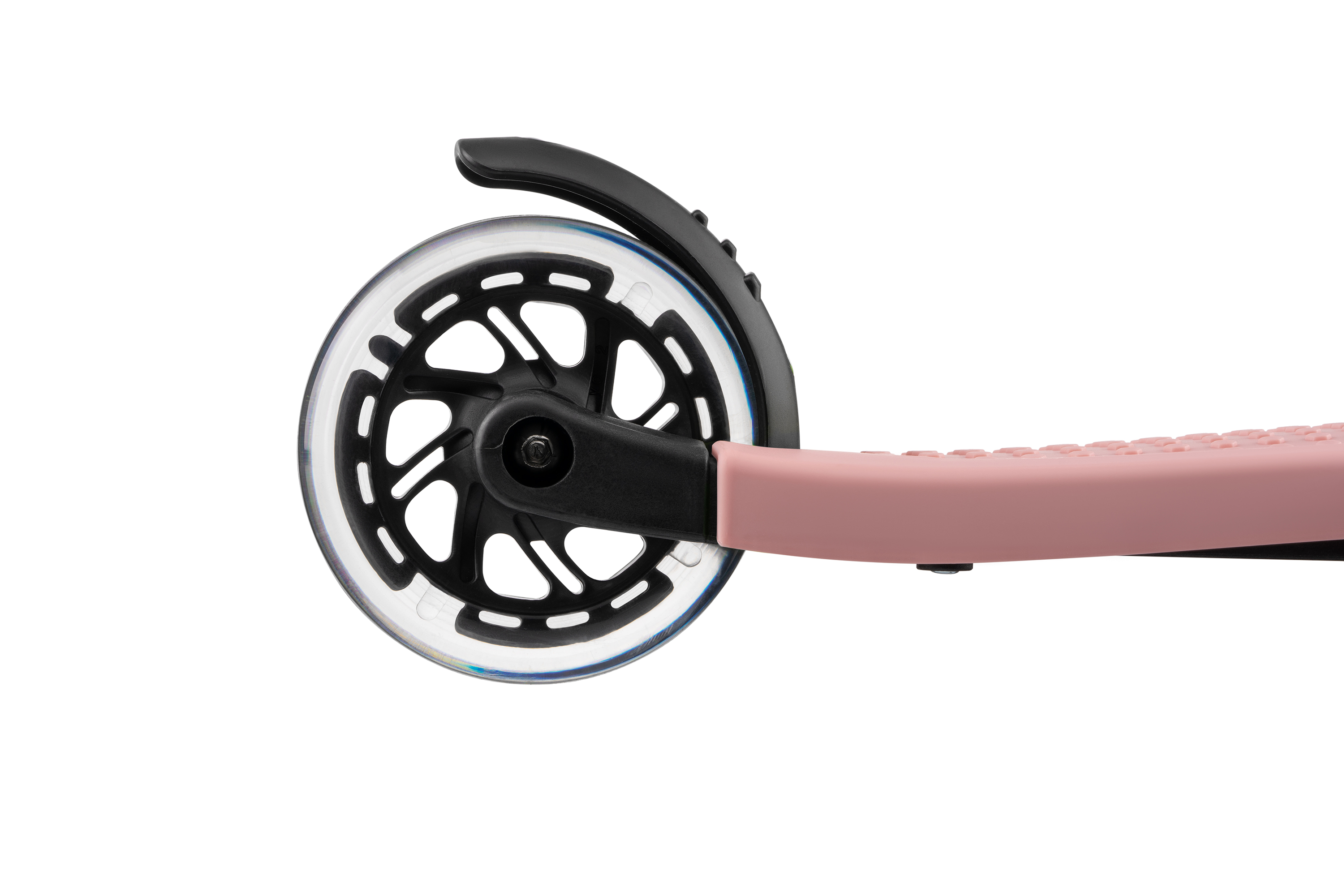 Заднє колесо має надійне ножне гальмо з металевою вставкою. Поліуретанові колеса мають LED-підсвічування.