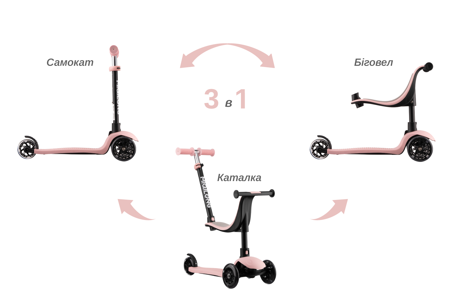 У варіанті біговела дитина розміщується сидячи на сидінні і сама управляє штовханням та напрямком їзди. (рекомендується від 18 місяців)