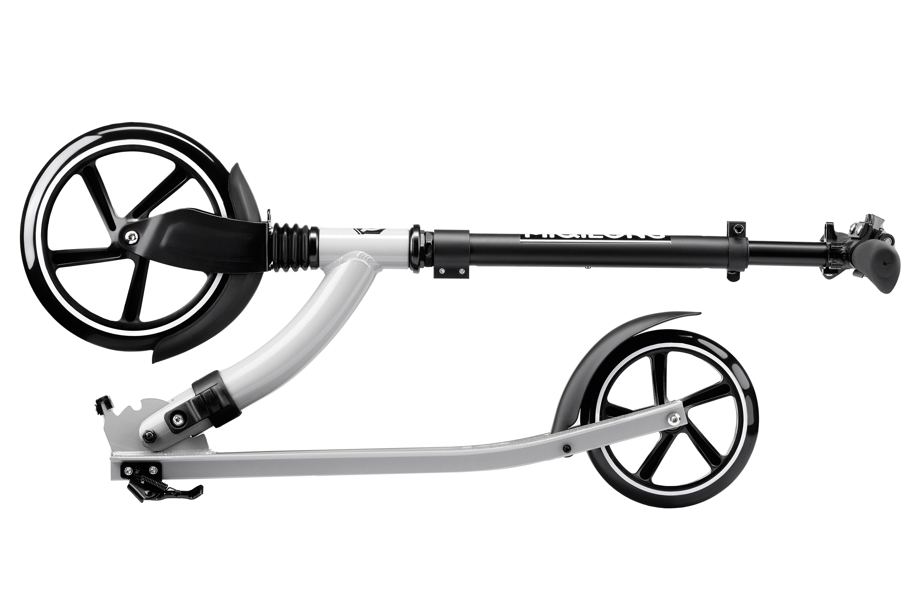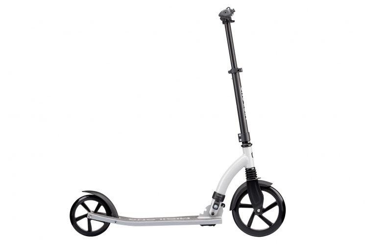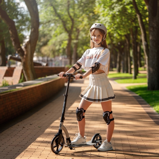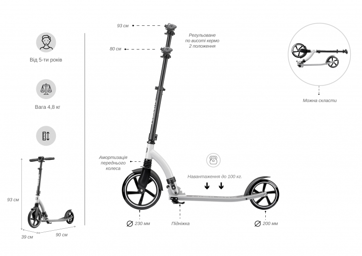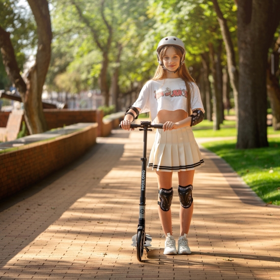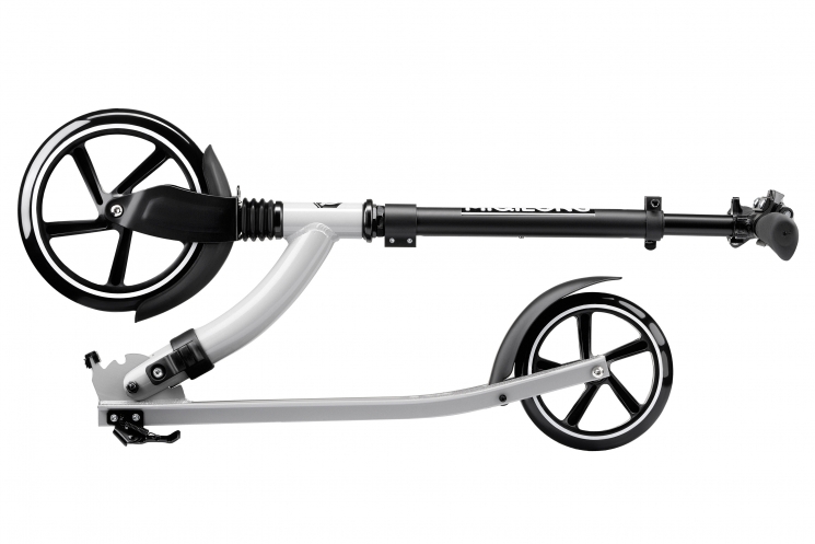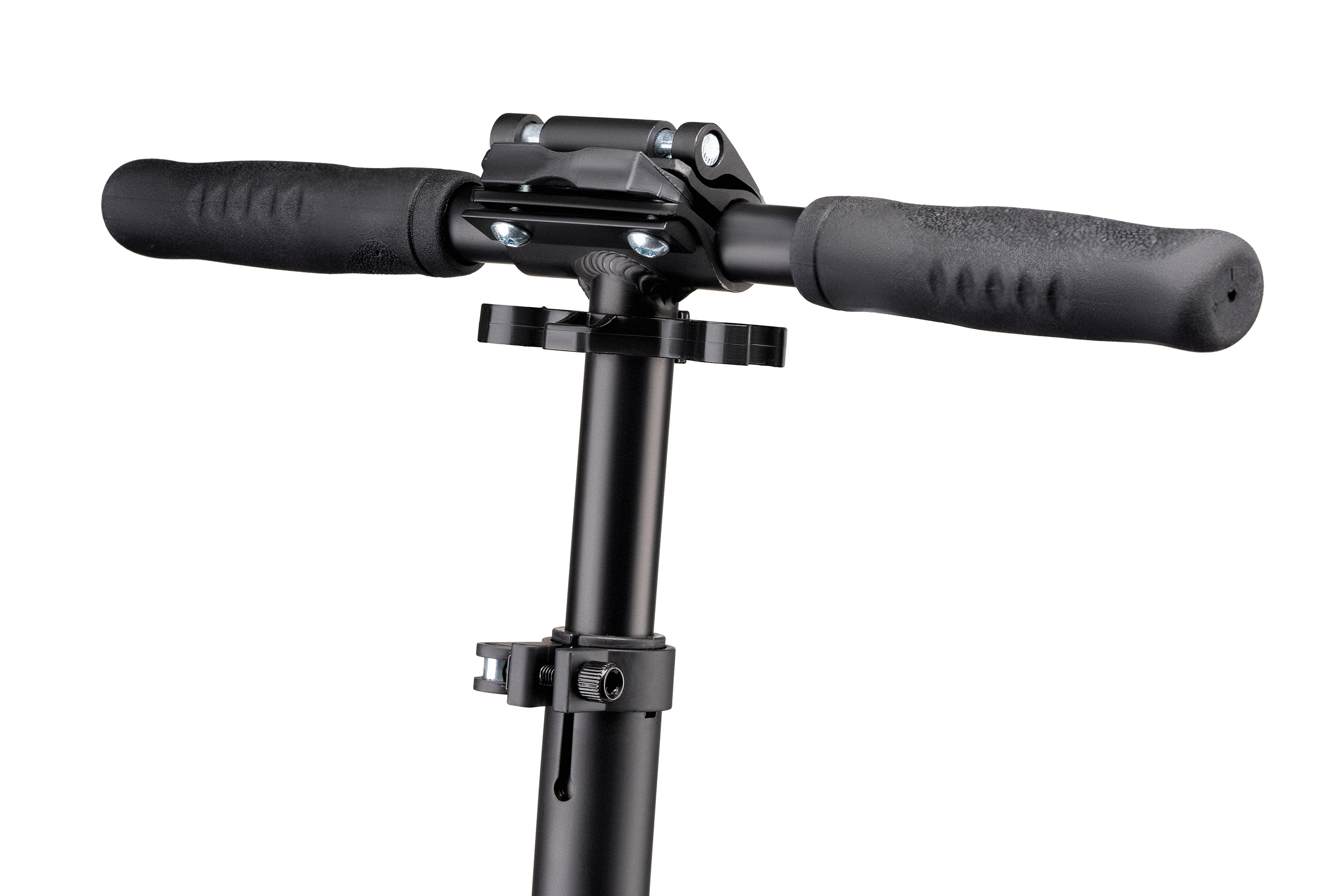 Для зручності зберігання та транспортування самокат повністю складається, включаючи ручки. Ручки фіксуються затискним механізмом, який забезпечує повну відсутність вібрації в місцях фіксації.