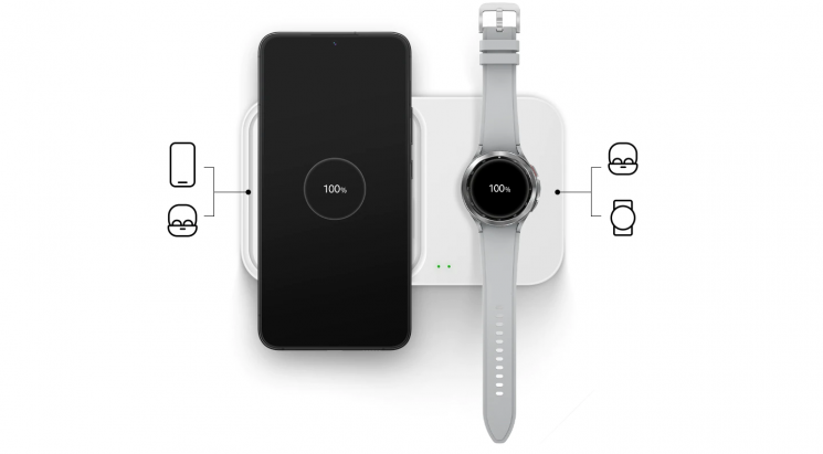 Заряджайте улюблену пару пристроїв одночасно — наприклад, смартфон і Galaxy Watch або годинник Galaxy Watch та навушники Galaxy Buds.