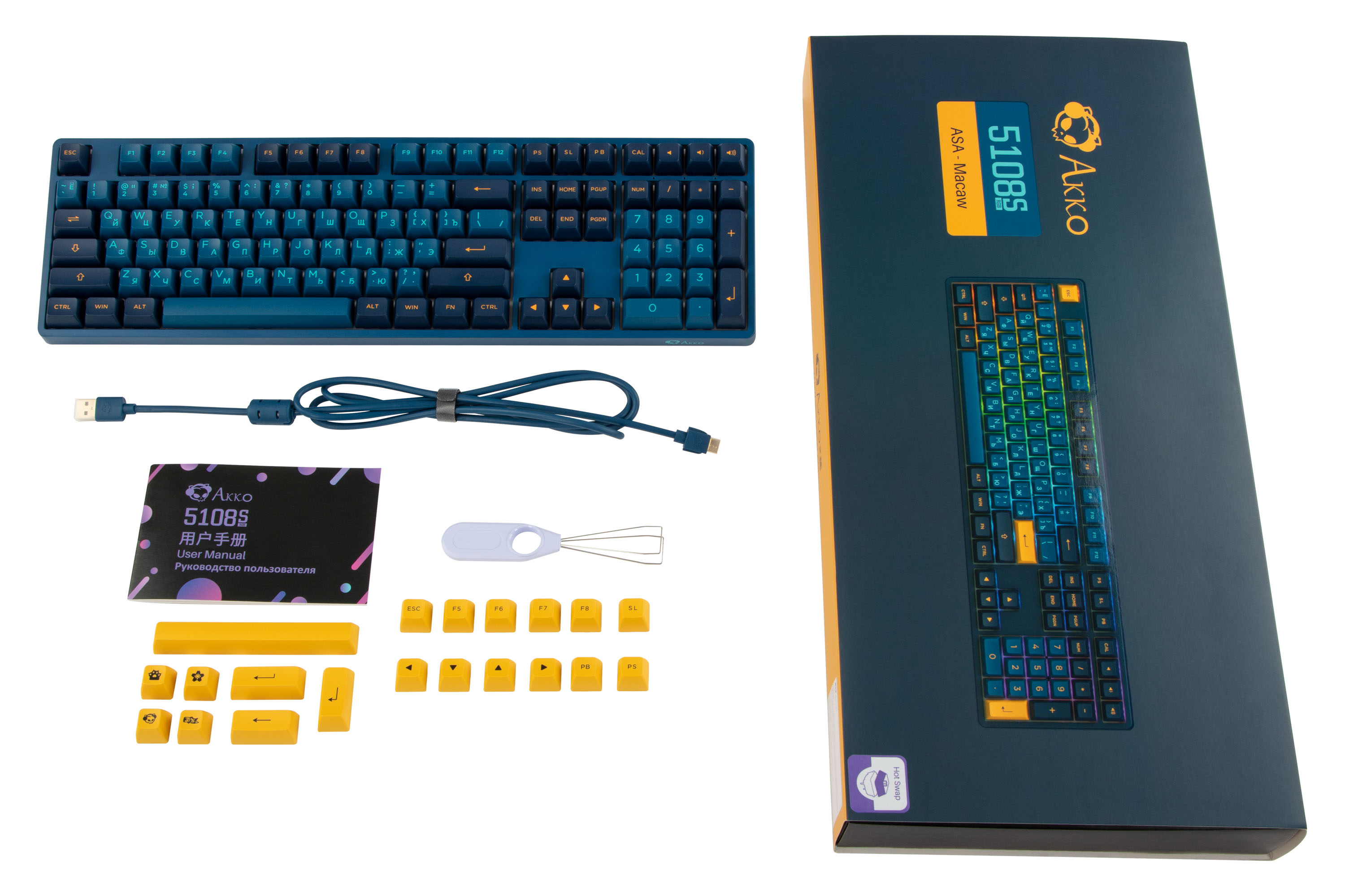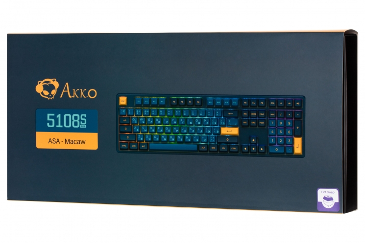 Механічна ігрова клавіатура Akko 5108S є складовою цілої серії периферії Akko, присвяченої яскравому сімейству папуг Ара (англ.: «Macaw»). Це повнорозмірна дротова клавіатура, яка вирізняється контрастним дизайном, у якому вдало поєднано сині та жовті кольори. Таке саме красиве природне поєднання кольорів має оперення тропічних птахів, звідси й походить назва серії.