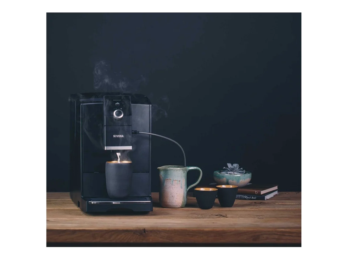 Автоматична кавоварка Nivona CafeRomatica 790 (NICR 790) виготовляється в сучасному елегантному дизайні в пластиковому корпусі матово-чорного кольору. Компактний настільний апарат потужністю 1455 Вт створює тиск 15 бар і варить напої з зерен і меленої кави.