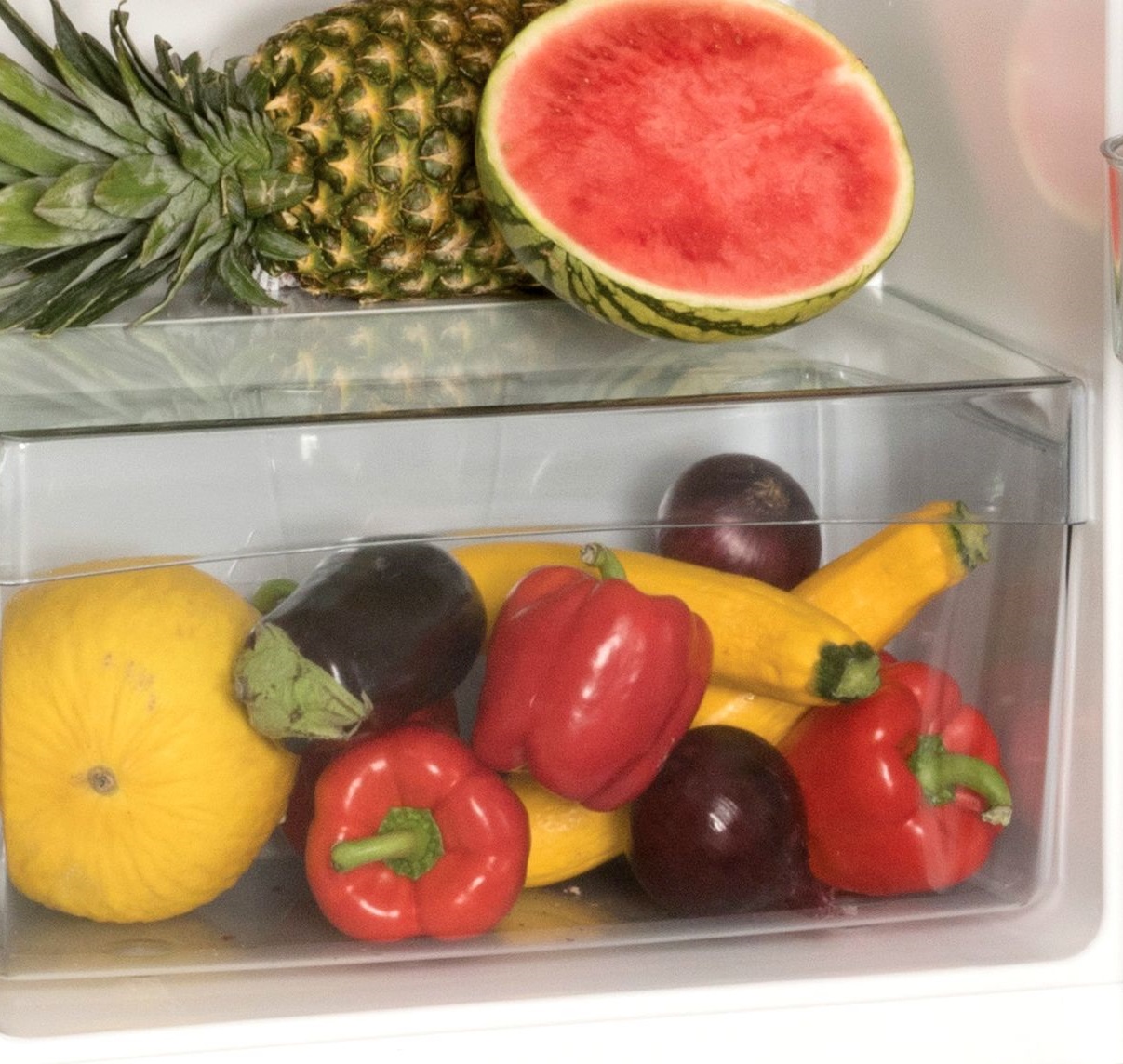 Також холодильник має дуже продуманий внутрішній простір, що дозволяє ефективно використати весь корисний об'єм. У дверях холодильної камери розташовані спеціальні відсіки. Їхня місткість дозволить зберігати безліч різних продуктів. Крім того, ці лотки можна міняти місцями. Є окремий лоток для зберігання пляшок різного об'єму. Він досить глибокий, що не дасть ємності випасти при відчиненні дверцят. Полиці цієї моделі виконані з міцного скла, яке здатне витримати досить велику вагу. Крім цього, такі полиці легко чистити. Також ви можете регулювати їхню висоту. Є й окрема скринька, в якій можна зберігати овочі та фрукти. Там вони довше залишатимуться корисними та свіжими.