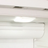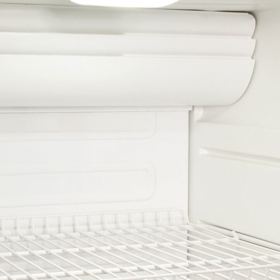 Холодильник працює досить тихо, рівень шуму складає 43 дБ. У даній моделі немає морозильного відділення. Двері холодильника виготовлені зі скла з алюмінієвою рамою. Максимально допустиме завантаження однієї полиці складає 40 кг.