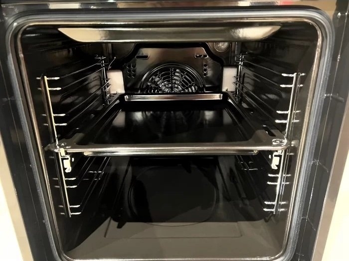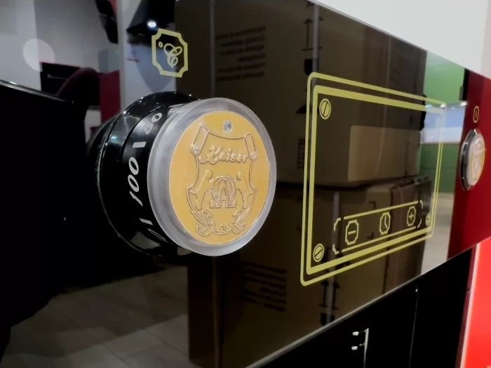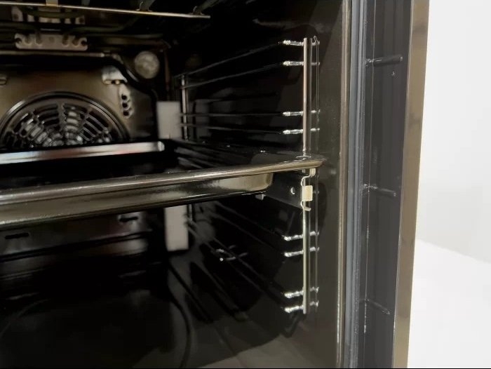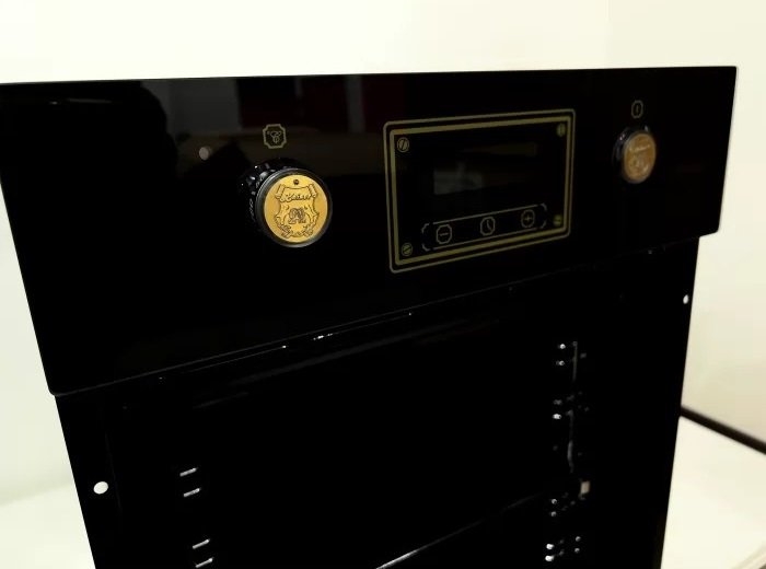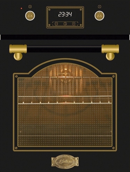Вбудовувана електрична духова шафа Kaiser EH4796AD. Дизайн: модельний ряд Art Deco; металева ручка, покрита екошкірою Antique Gold з опуклим гербом; панорамне внутрішнє скло дверцят з таблицею рецептів. Оснащення: система тангенціального охолодження; хромовані драбинки для розміщення дека; 4 рівні для розміщення дека; система Телескоп; конвекція (система обдування гарячим повітрям); інфрачервоний гриль.