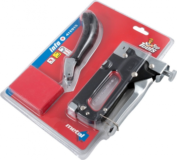 Степлер обивочний Top Tools (арт. 41E904) для скоб J розміром 6 - 14 мм. Металевий корпус гарантує довговічність інструмента. Ідеально підходить для обивочних й інтер’єрних робіт, кріплення плівки та шкіри. Завдяки регульованій силі вбивання скоб степлер може використовуватися як для м’яких, так і твердих матеріалів. Міцне металеве руків’я ергономічної форми вкрите пластиком, до підвищує комфорт експлуатації.