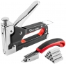 Комплект містить обивочний степлер для скоб J розміром 6-14 мм, скоби J і розшивач для скоб. Степлер виготовлений з металу, має регулятор сили вбивання скоб і блокувальне кільце.