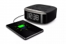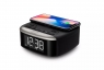 На передній панелі цього радіогодинника Bluetooth видно великий, чіткий цифровий дисплей. Елементи керування знаходяться на верхній панелі, яка також має зарядний килимок Qi для телефону. Для старіших телефонів є роз’єм для заряджання USB.