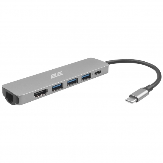 Концентратор Type-C, 2E "6-in-1", Grey, HDMI / 2xUSB 2.0 / 1xUSB 3.0 / 1xType-C PD / GLan, металевий корпус (2EW-2684)