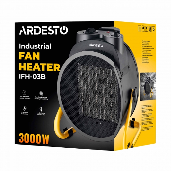 Підлоговий обігрівач ARDESTO IFH-03B потужністю 3000 Вт стане в нагоді для обігріву гаражів, майстерень чи на будівельних майданчиків. Ефективно та швидко впорається з обігрівом приміщень площею до 30 м2 , завдяки керамічному нагрівальному елементу PTC.
