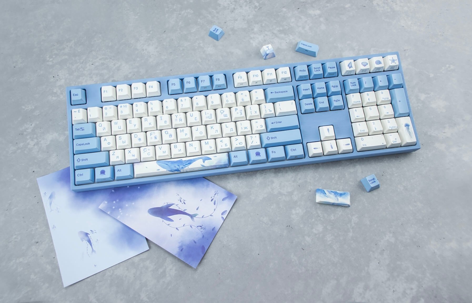 Varmilo Sea Melody – це сповнена натхнення історія морської гладі, реалізована через унікальний дизайн пристрою. Механічна клавіатура для митців, розробників і гравців в унікальному дизайні, що поєднує ніжні лазурові відтінки морської блакиті з класичними білими клавішами. Це деталізація підводного світу через художній розпис у формі хвиль, медуз, китів і морської гладі.