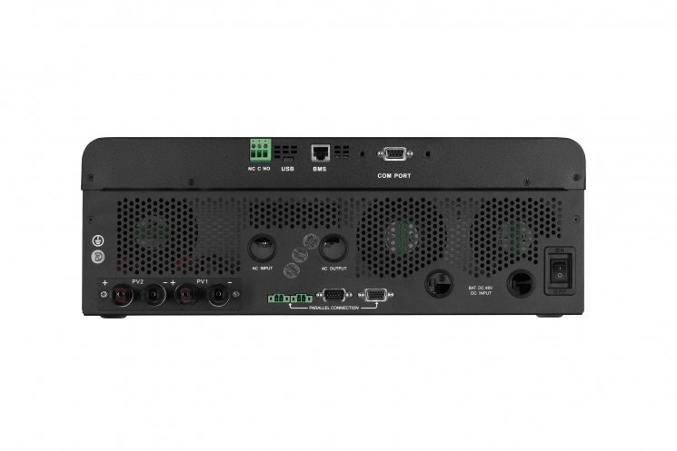 Розв’язати складні й енергоємні завдання допоможе інвертор XM-8K48T потужністю 8 кВт (8 000 ВА). З-поміж особливостей моделі: підтримання одно- чи трифазної конфігурації, а також можливість паралельної роботи до 6 пристроїв одночасно! XM-8K48T повністю автономний і має вбудовані мережевий і сонячний зарядні пристрої, тож його легко можна підключити до фотоелектричного масиву максимальною потужністю 2 × 4 000 Вт (Isc – 2 × 27 A). Так, вікно МРРТ: 90-450 В постійного струму (2 × MPPT). Інвертор забезпечує чисту синусоїду 230 В (Hardwired) у режимі роботи від батареї. Для повноцінного функціонування пристрою не потрібен акумулятор, та за потреби (для накопичення енергії) можна під’єднувати зовнішні батареї 48 В різних типів, максимальний струм ЗП – 150 А.