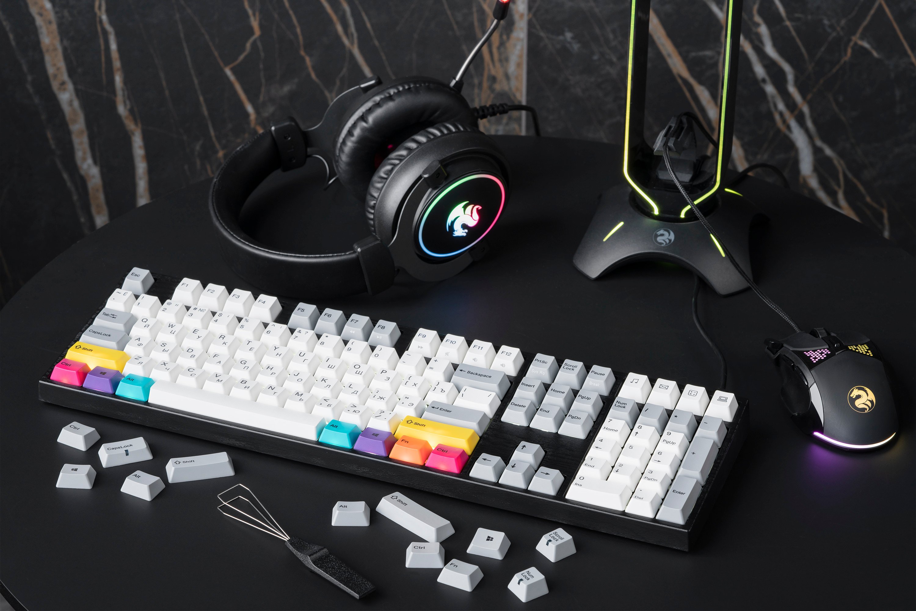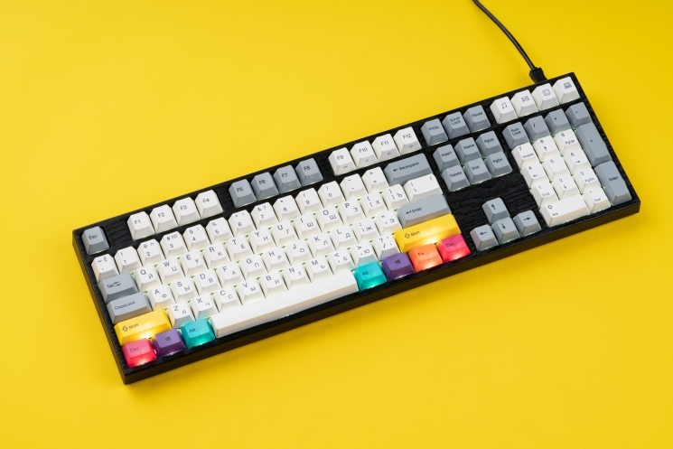 Varmilo CMYK – це класична і водночас ефектна механічна клавіатура, оснащена яскравими клавішами, які створюють унікальну дизайнерську філософію пристрою. Основний колір моделі CMYK – холодний білий, який плавно переходить у сірий, а головну візуальну стилістику пристрою створюють яскраві клавішні ковпачки у жовтому, рожевому, фіолетовому, помаранчевому та блакитному кольорах. Справжній арт-дизайн у сучасних технологіях.