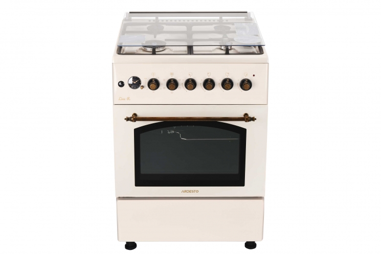 Комбінована плита ARDESTO Line-R FSCF-C607CR кремового кольору в ретродизайні. Має чотири газові конфорки (пальники), вкриті чавунними решітками. Запалювання автоматичне, в ручці. Додатково в комплекті змінні форсунки для скрапленого газу (LPG).