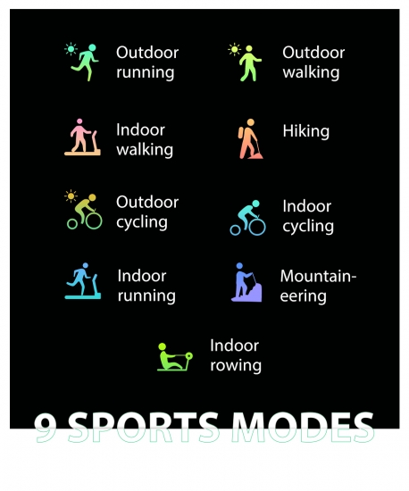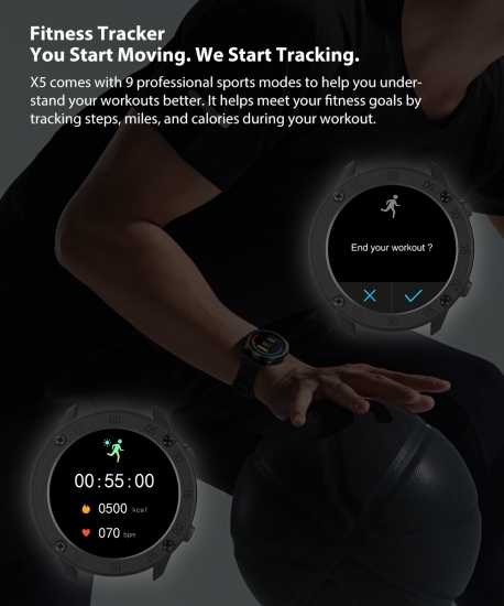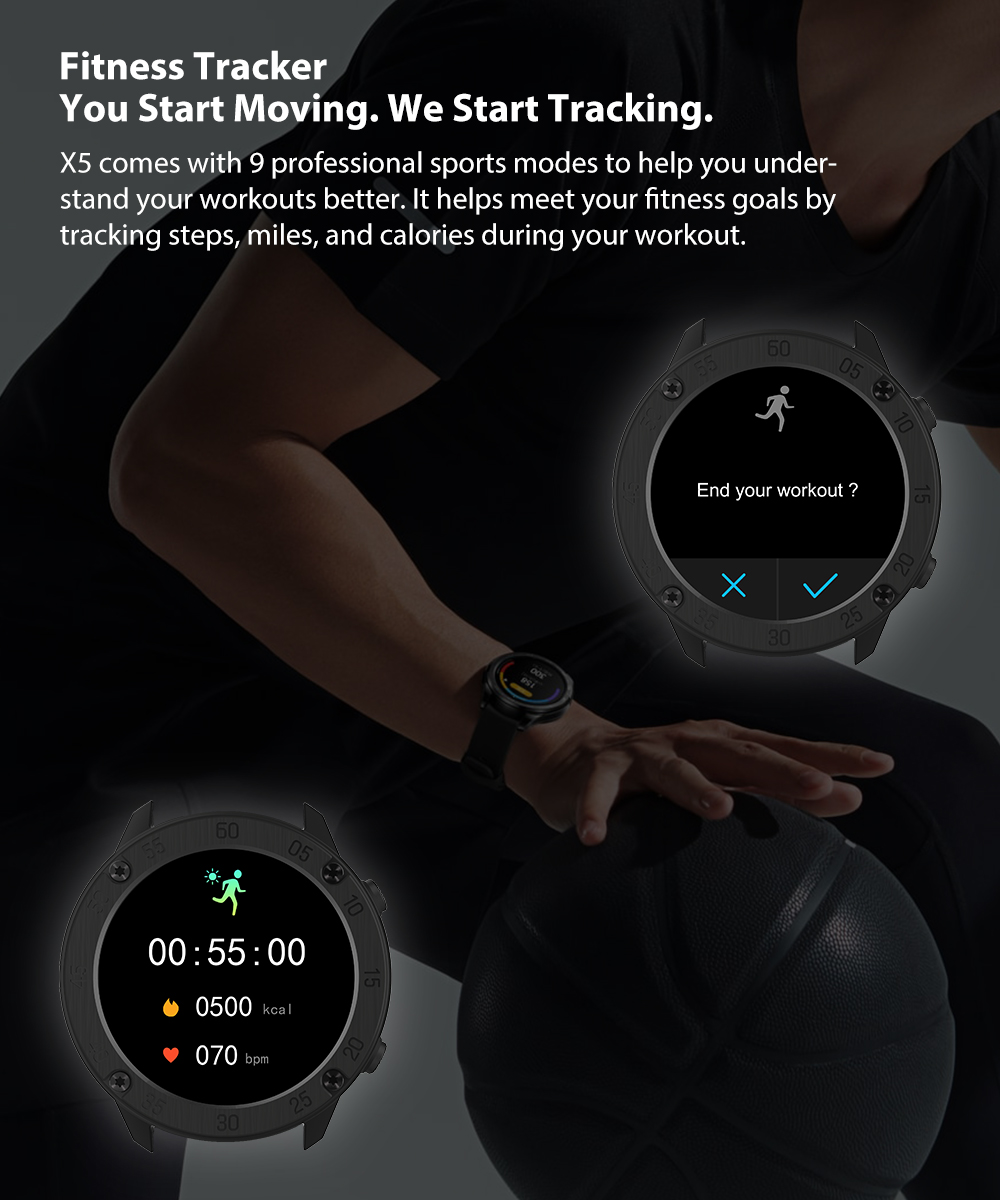 X5 має 9 професійних спортивних режимів, які допоможуть вам краще зрозуміти свої тренування. Він допомагає досягти ваших фітнес-цілей, відстежуючи кроки, милі та калорії під час тренування.