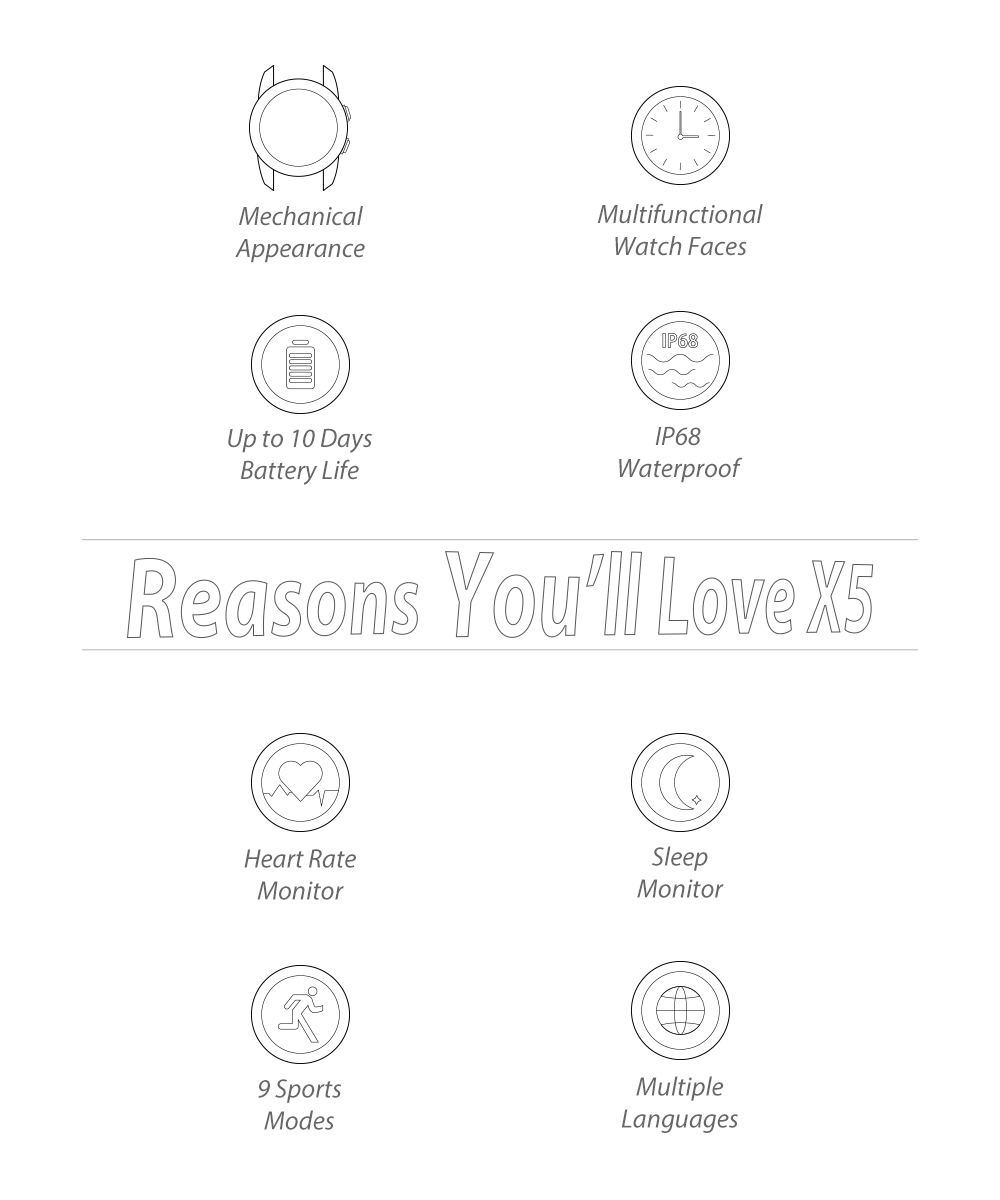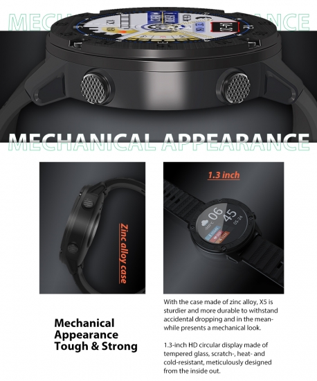 Завдяки корпусу з цинкового сплаву, X5 міцніший і довговічніший, витримує випадкові падіння і водночас має механічний вигляд. 1,3-дюймовий круглий HD-дисплей із загартованого скла, стійкий до подряпин, спеки та холоду, ретельно продуманий зсередини до дрібниць.