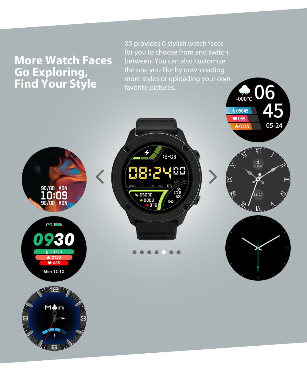 X5 пропонує 6 стильних циферблатів, які ви можете обирати та перемикати між собою. Ви також можете налаштувати той, який вам подобається, завантаживши більше стилів або завантаживши власні улюблені фотографії.