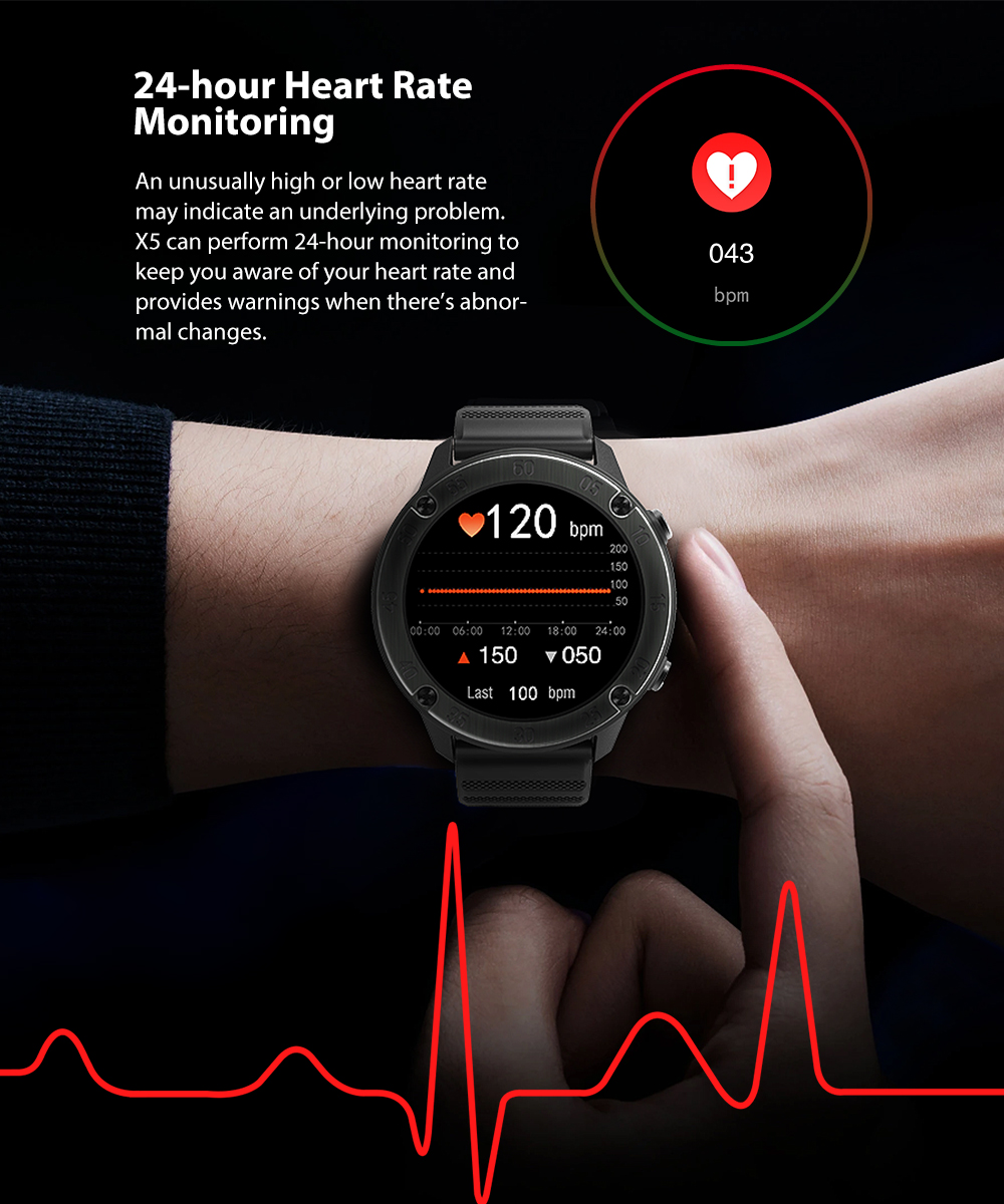 Незвично високий або низький пульс може свідчити про приховану проблему. X5 може здійснювати 24-годинний моніторинг, щоб тримати вас в курсі вашого серцебиття і попереджати про аномальні зміни.