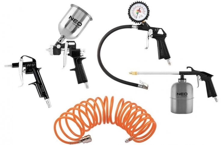 Головна - Побутова техніка, інструменти та товари для дому - Інструмент та обладнання - Пневмоінструмент - Фарборозпилювачі - Neo Tools - Набір фарбувальний, 5шт., пістолет-розпилювач, пістолет для продування, пістолет з манометром, спіральний шланг
