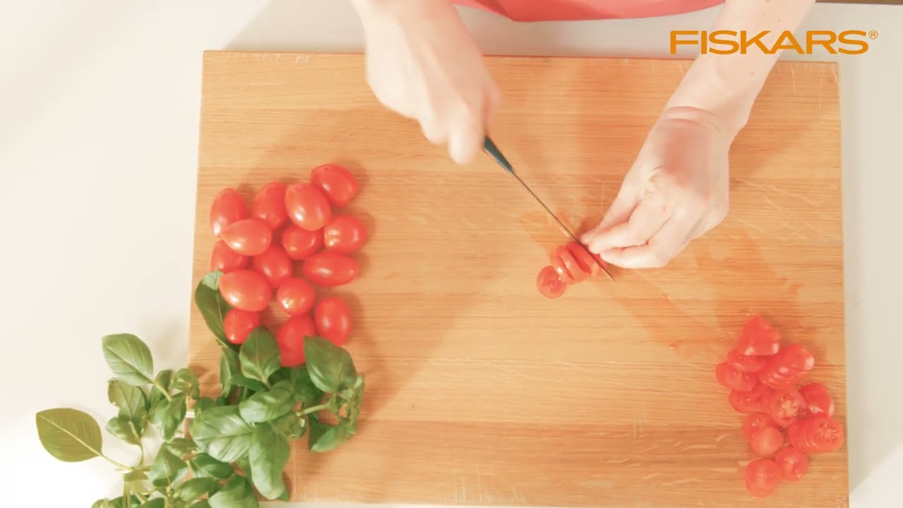 Ніж для томатів Fiskars підходить для нарізки овочів або фруктів з різною структурою – з твердою шкіркою та м'якою серединою: помідор, огірок, апельсин, лимон тощо. Хвилясте лезо довше тримає заточку та підійде для нарізування хлібобулочних виробів, ковбаси, сиру.