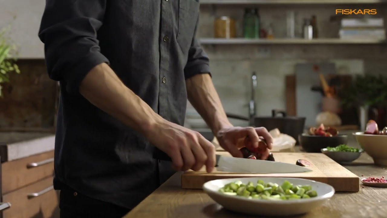 - Рекомендується заточувати за допомогою точилки Fiskars Roll-Sharp або точильного каменю з кутом 30+/-4