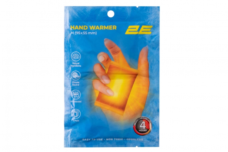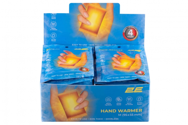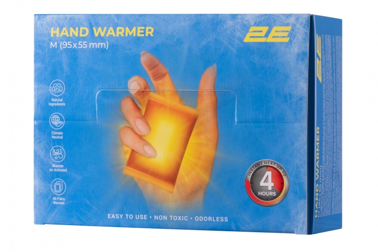 Хімічні грілки для рук 2E – це одноразовий, персональний засіб для локального обігріву. Розмір виробу 95 × 55 мм. Час дії після активації – до 4 годин. Середня температура грілки приблизно 55 °C, проте максимальна може сягати 68 °C, тож виріб може зумовити жар, а в разі надмірного застосування може спричинити локальні опіки чи подразнення шкіри. Важливо: якщо під час використання грілка занадто гаряча чи просто незручна, негайно зніміть її.