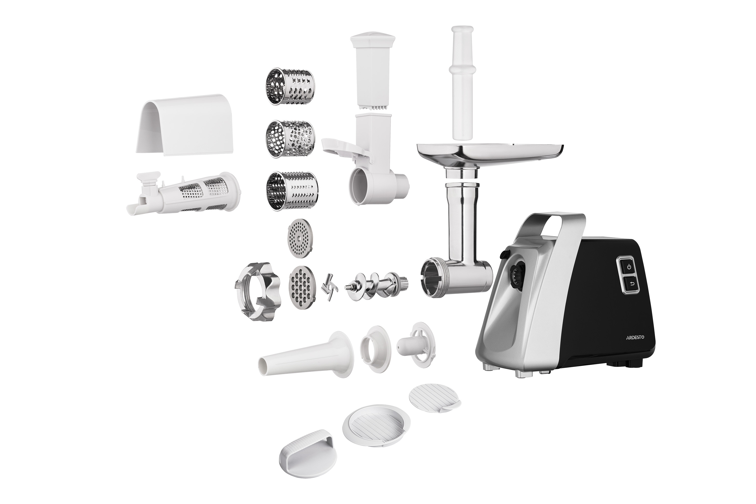 М'ясорубка ARDESTO, 2100Вт, 2кг/хв, 3 решітки, насадка для ковбас, кеббе, томатів, 3 терки, бургер-прес, пластик, чорно-срібний
