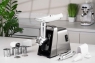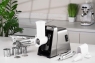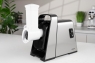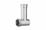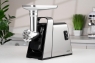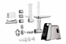 Різні насадки розширюють функціонал м’ясорубки й забезпечують можливість готувати ще більше смачних страв: чотири тертки – велика, стандартна, шатківниця, насадка для дерунів; насадка для ягідного чи томатного соку, а також для приготування кеббе та сосисок. На додачу в комплекті постачання міститься штовхач і три перфоровані металеві диски з отворами різного діаметра для грубого, стандартного та дрібного помелу (7 мм/5 мм/3 мм), які можна скласти у відсік для зберігання, що передбачений конструкцією м’ясорубки.