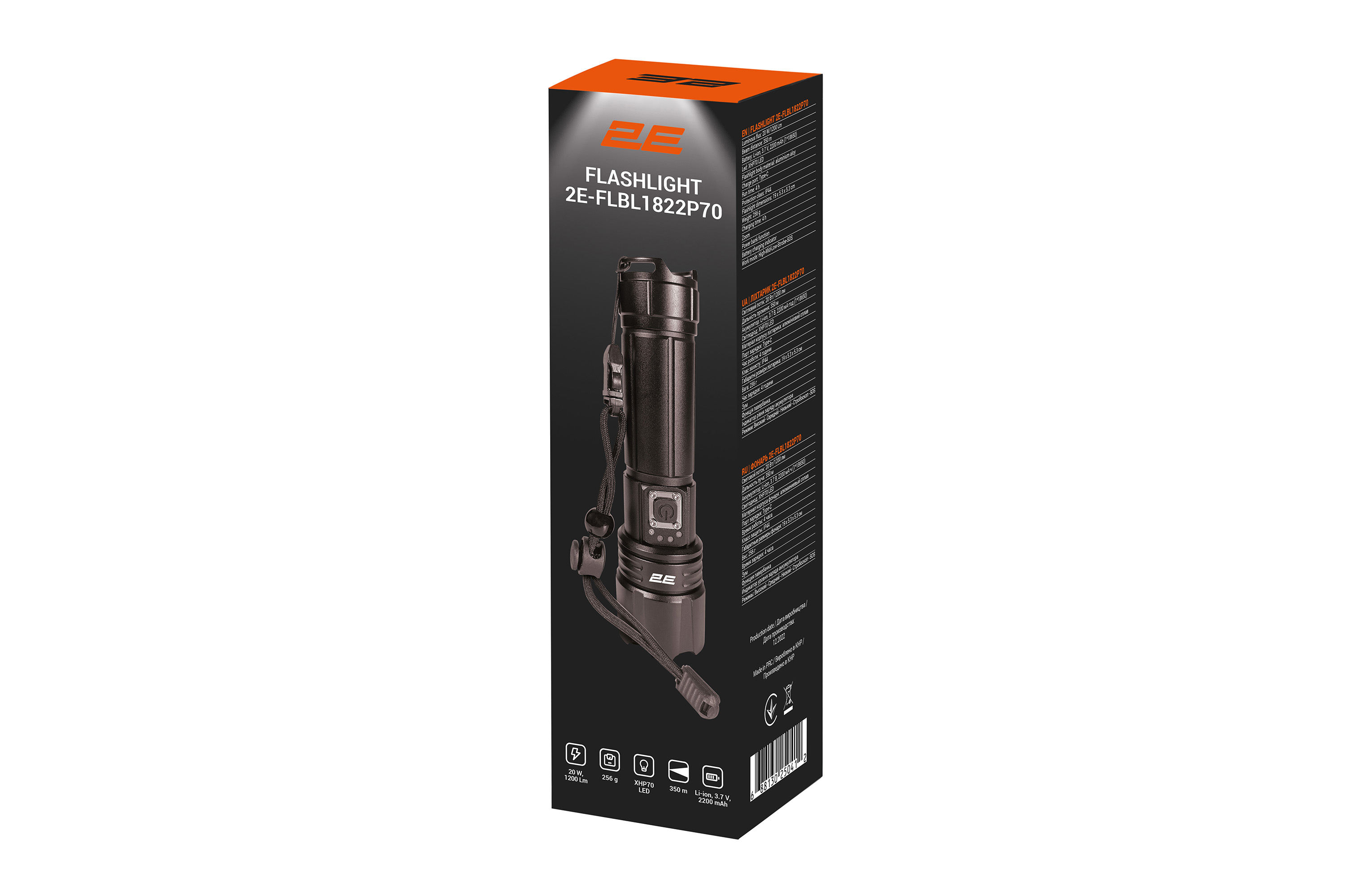 Опис Ліхтар ручний акумуляторний 2E FLBL1822P70 USB-C 2200мА·год 1200лм 20Вт 5 режимів освітлення функція Power Bank IP44 0.26кг