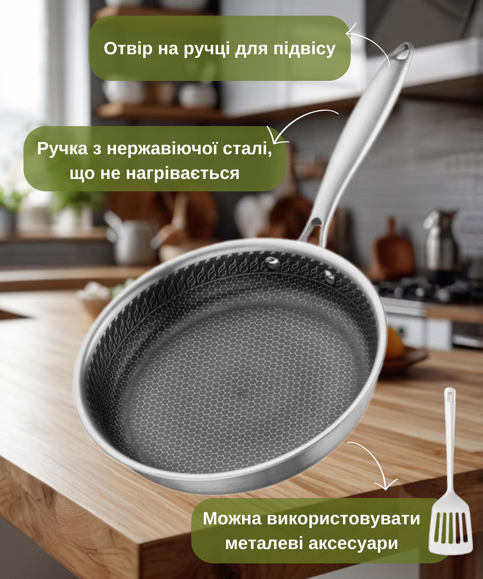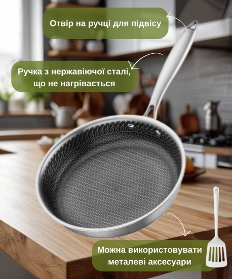 Виготовлена з нержавіючої сталі за технологією Triply, сковорода має протипригарне покриття, стійке до подряпин. Можна використовувати металеві аксесуари. Виріб можна мити в посудомийній машині. Діаметр моделі становить 26 см. За висоти 5 см сковорода має однакову товщину стінок і дна – 2,5 мм. Вирізняється широкою сумісністю: сковорідка придатна до використання на газових, галогенних, склокерамічних, індукційних та електричних плитах.
